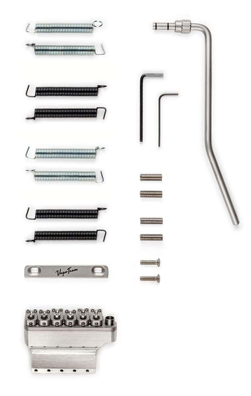 VT1 Ultra Trem 2-points Para guitarras equipadas con sistema de vibrato de 2 puntos. Acabado en acero inoxidable de alta calidad. El paquete incluye muelles, adaptadores y tornillos para el fulcro y llaves allen de 1,5 mm (1/16) y 2,5 mm (3/32). El sistema patentado VT (ES 1119430 U) se basa en dos principios básicos: la adaptación de las dimensiones del puente a la cavidad estándar existente en los modelos ST y el sistema de pivote del puente. Para optimizar el movimiento del puente, el centro de acción pivotante se ha cambiado añadiendo una pieza (fulcro) que reemplaza el concepto tradicional de soporte en tornillos, dando más amplitud a ese movimiento. La forma del punto de apoyo de la placa en el fulcro también ha sido cambiada, minimizando la fricción, que es prácticamente inexistente. El resultado es una acción homogénea muy placentera para la interpretación musical totalmente libre de ruidos no deseados. (Se recomienda el uso de tuercas de bajo rozamiento y afinadores de bloqueo).