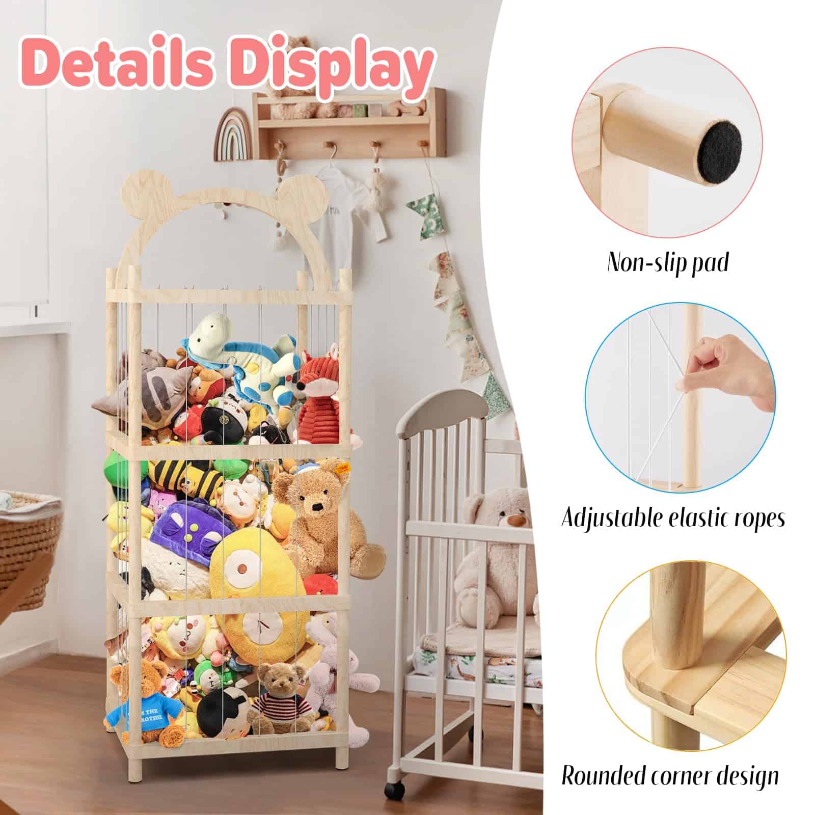 1. DISEÑO ORIGINAL: Nuestro organizador de juguetes de peluche de madera es un sistema original de almacenamiento de juguetes suaves. El diseño único de estilo zoológico tiene un gran atractivo para los niños y puede despertar su interés en organizar juguetes para construir buenos hábitos. Las esquinas redondeadas evitan que los niños se golpeen y la construcción resistente evita que se vuelque, brindando a usted y a su familia una protección completa.