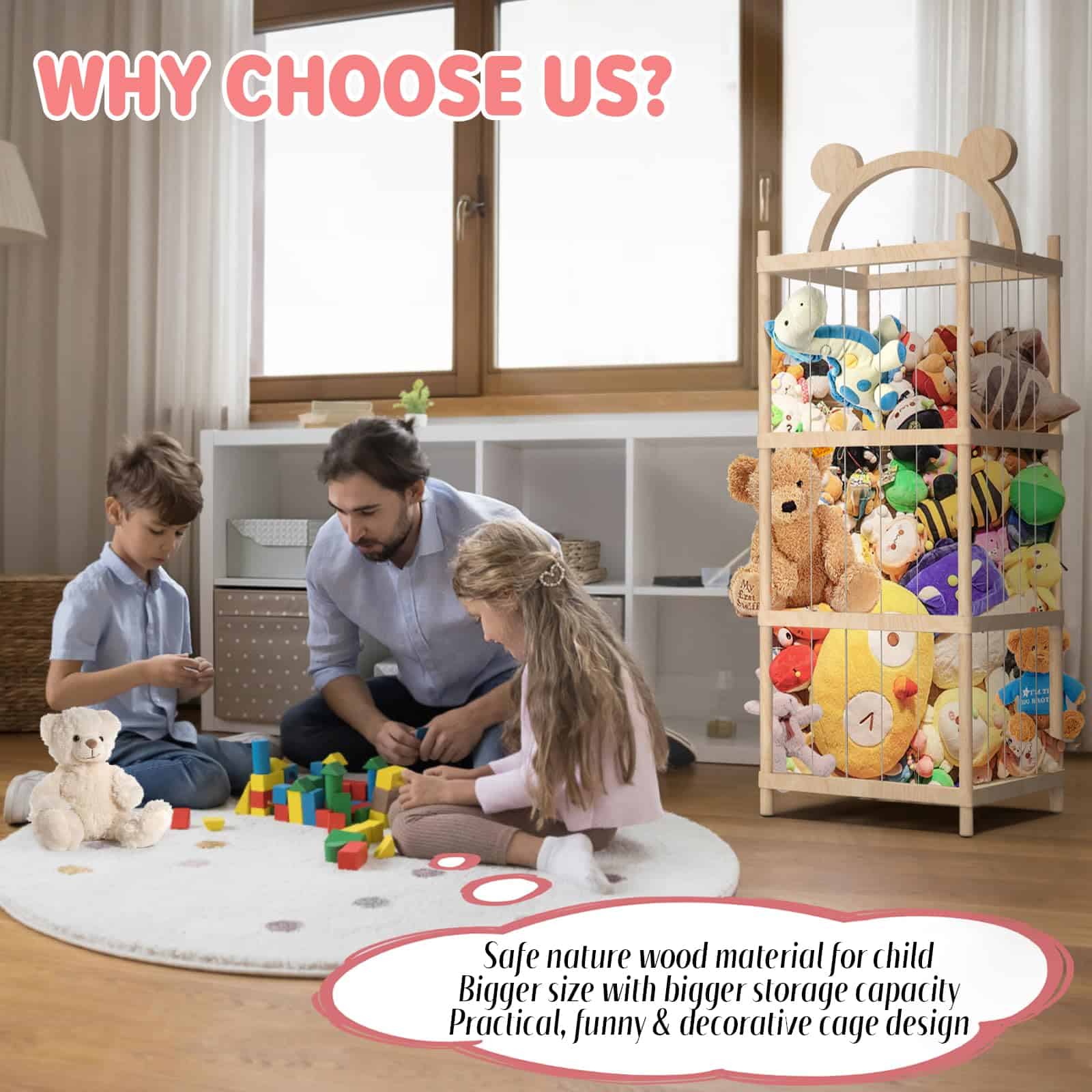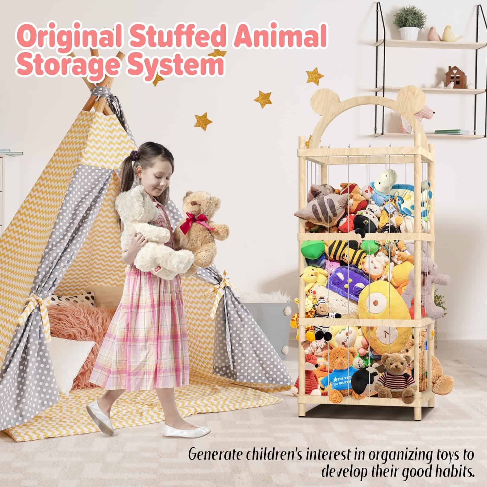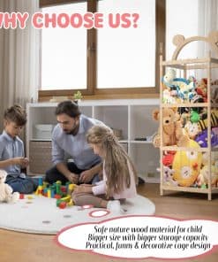 3. ORGANIZACIÓN PODEROSA: El tamaño de la jaula de almacenamiento de juguetes de madera maciza es de 17 x 17 x 48 pulgadas. Diseño de almacenamiento vertical para ocupar poco espacio y tener una gran capacidad. Puede contener todo tipo y tamaños de animales de peluche. Mantenga los animales de peluche y los juguetes blandos alejados del suelo y reduzca el desorden.