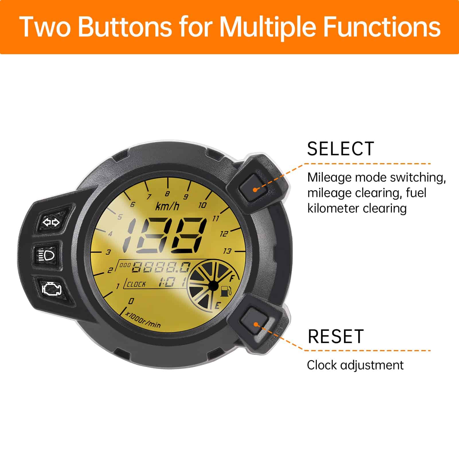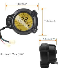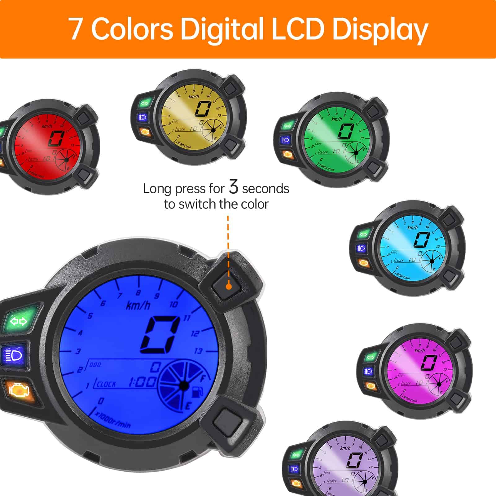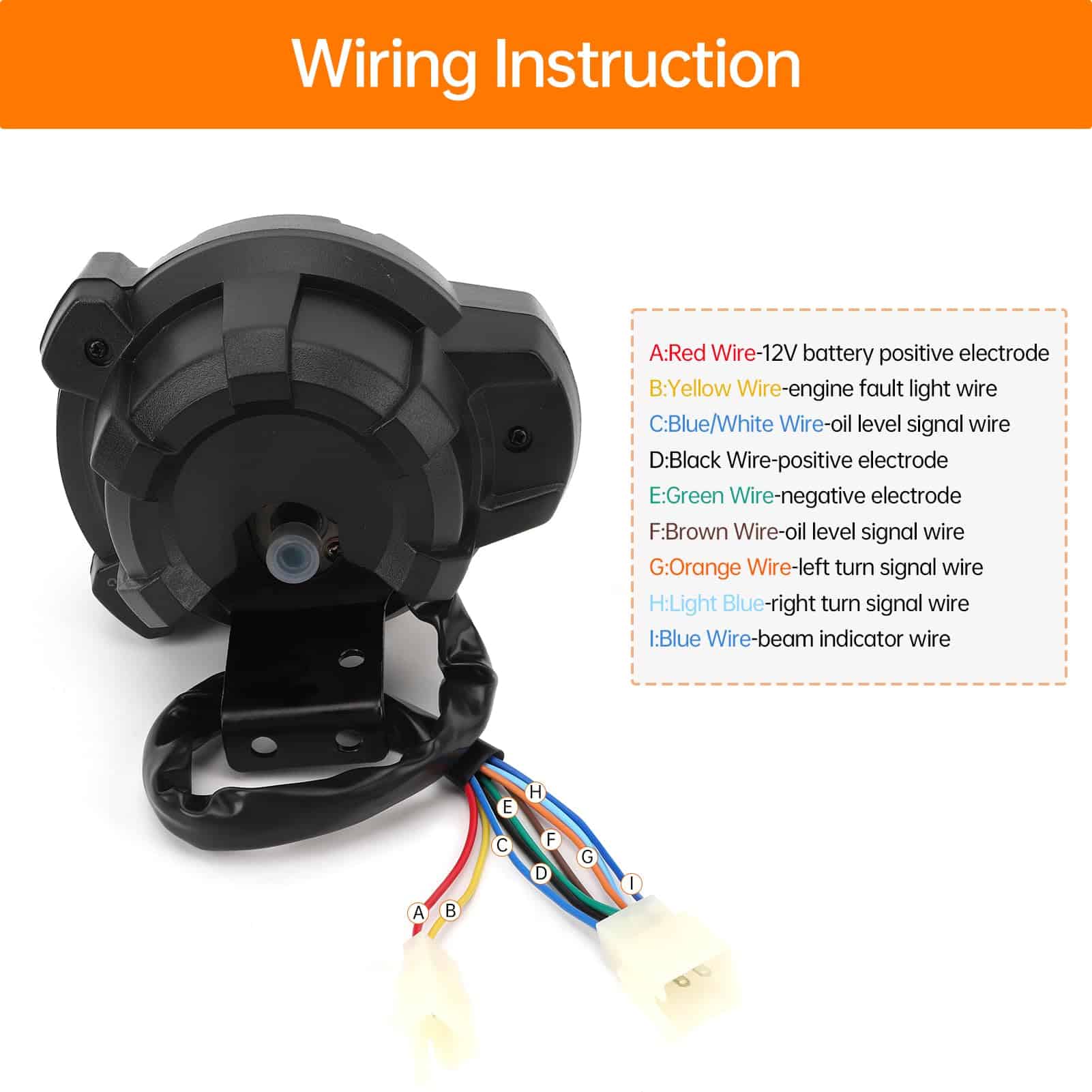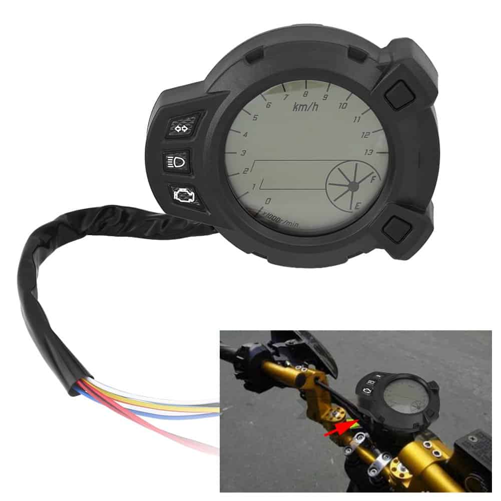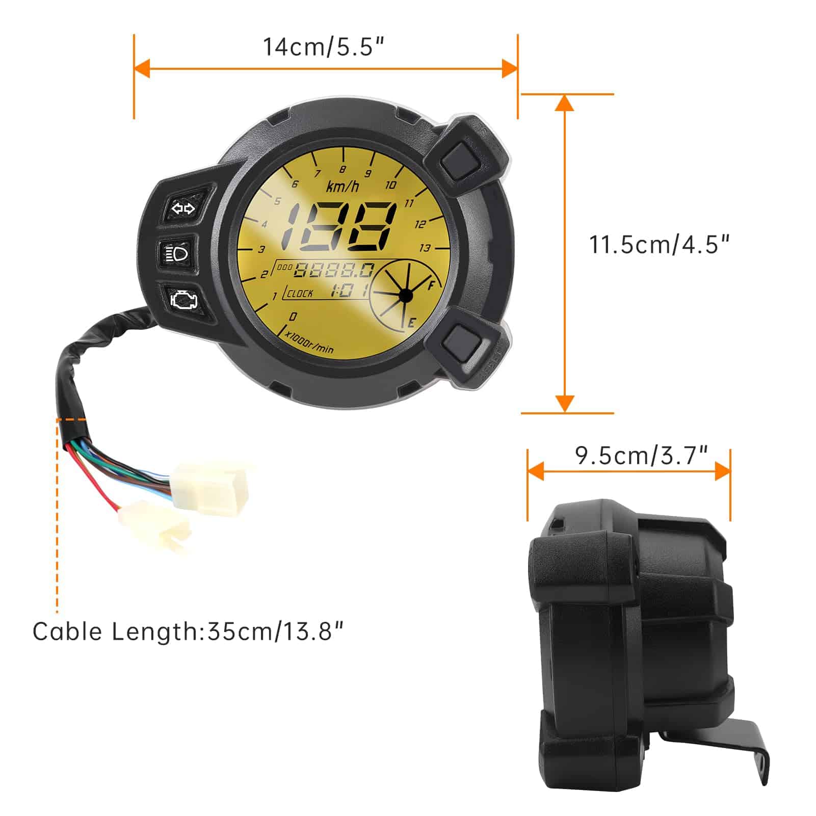 Descripción: Este es un velocímetro digital integrado con tacómetro e indicador de marcha, con pantalla LCD que muestra la velocidad de rotación y la marcha con precisión. Así que no dudes en adquirir uno para mejorar tu seguridad en las carreras. Características: 1. Tacómetro odometro de motocicleta con alta sensibilidad y precisión inigualable. 2. Pantalla LCD para velocidad, odómetro, viaje, metro, posición de marcha, nivel de combustible y reloj en tiempo real. 3. Cambio controlado por botón entre Odómetro y Medidor de viaje, Km/h y Mp/h. 4. Recordatorio de cambio de aceite anormal, advertencia de voltaje y alarma de bajo nivel de aceite. 5. Se puede aplicar a diferentes vehículos con diferentes diámetros y desplazamientos. 6. Hecho de duradero cascarón de plástico ABS, a prueba de golpes y resistente a la corrosión. 7. Con retroiluminación de 7 colores, no solo conveniente para la lectura de datos, sino que también le da a la motocicleta una apariencia destacada. 8. Fácil de usar y fácil de quitar, las instrucciones de instalación están incluidas. Especificaciones: Material: ABS Color de cascarón: Negro Color de luz: 7 colores Voltaje de trabajo: DC 12V Tamaño: 14 11.5 9.5cm/5.5 4.5 3.7in Longitud del cable: 35cm/13.8in Peso del paquete: aprox. 560g Compatibilidad: para Yamaha BW125, también compatible universal para 1 cilindro (no incluye motor de inyección electrónica) Paquete incluido: 1 Velocímetro de motocicleta Notas: Este instrumento no tiene sensor, la función de RPM se utiliza con el eje flexible de la rueda delantera.