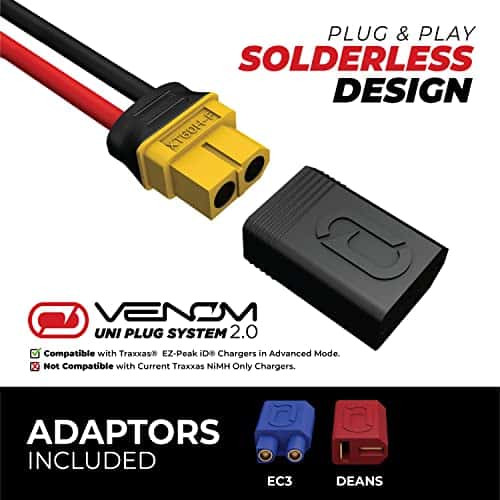 Obtén un rendimiento superior de tus helicópteros, jets, aviones y vehículos RC voladores controlados a distancia con este pack de batería LiPo de alto rendimiento y alta tasa de descarga de 30C 4S 3200mAh 14.8V de Venom. Tiene un equilibrio de LiPo integrado y conector XT60 para asegurar que tus dispositivos de alta potencia estén listos para largas sesiones de carreras y excursiones deportivas. La batería cuenta con una potente tasa de C de 30C y un sistema de enchufe universal patentado que viene precableado con arnés de cableado de silicona suave y flexible de calibre 12 que permite una instalación fácil plug & play. Se ajusta principalmente a estos modelos de RC: AeroWorks Extra 260 Freestyle QB-L (ELEX260FRYB52), Durafly D.H.110 Sea Vixen EDF 1000mm, E-flite Carbon-Z Yak 54 3X (EFL10550)/(EFL10575), E-flite Fury 15 DF (EFL7250), E-flite Rare Bear, E-flite Super Cub 25e (EFL4625), E-flite Super Cub 25e ARF, Flitework Red Bull PT-17 Stearman RR (FLWA4110), Hangar 9 Alpha 40 Trainer (HAN2460), Hangar 9 Christen Eagle II 90, Hangar 9 Piper J-3 Cub 40″, Hangar 9 Twist 40 Versión 2 (HAN2660), Multiplex Rockstar RR 41″ (M264278), Sig Sbach XA-41 3D Sport EP 50″ (SIGRC105EPARF), Sig T-Clips 60″ (SIGRC87EPARF), Staufenbiel Red Bull Edge 540, Staufenbiel Red Bull F4U-4. Batería Venom Comparable: Venom 30C 4S 3200mAh 14.8V LiPo (15013) Batería Competidora Comparable: E-flite 2500mAh 4S 14.8V 30C LiPo Battery (EFLB25004S30) E-flite 2800mAh 4S 14.8V 30C LiPo Battery (EFLB28004S30) E-flite 3200mAh 4S 14.8V 20C LiPo Battery (EFLB32004S) E-flite 3200mAh 4S 14.8V 30C LiPo Battery (EFLB32004S30) E-flite 3300mAh 4S 14.8V 50C LiPo Battery (EFLB33004S50) Turnigy 3300mAh 4S 25C LiPo Battery (N3300.4S.25)