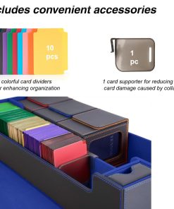 Innovative Card Support Designed to prevent your valuable cards from bending or collapsing. Even when the card storage box isn’t fully packed, the supporter ensures your cards stay upright, avoiding damage and domino-like toppling. This feature not only preserves the condition of your cards but also elevates the collectible value of your growing collection by keeping them in pristine shape. Colorful Dividers for Simple Organization This card storage is equipped with 10 colorful card dividers, making it easy to organize and categorize cards and accessories. This setup allows for quick card identification and retrieval, saving time and enhancing efficiency. Versatile Card Collection Box Designed for gamers, our deck card boxes are perfect for a variety of game cards. Compatible with Magic: The Gathering,One Piece, Pokémon, YuGiOh!, Duel Masters, and sports cards such as football, basketball, and baseball cards in penny sleeves, as well as Dominion cards and expansions, and more collectibles. Collector’s Essentials or Gift Featuring a sturdy PU leather shell for shock protection and a soft microfiber interior to safeguard cards against scratches, this large trading card box includes multiple magnets for a secure closure, ensuring safe transportation. It’s a top-notch choice for TCG players!