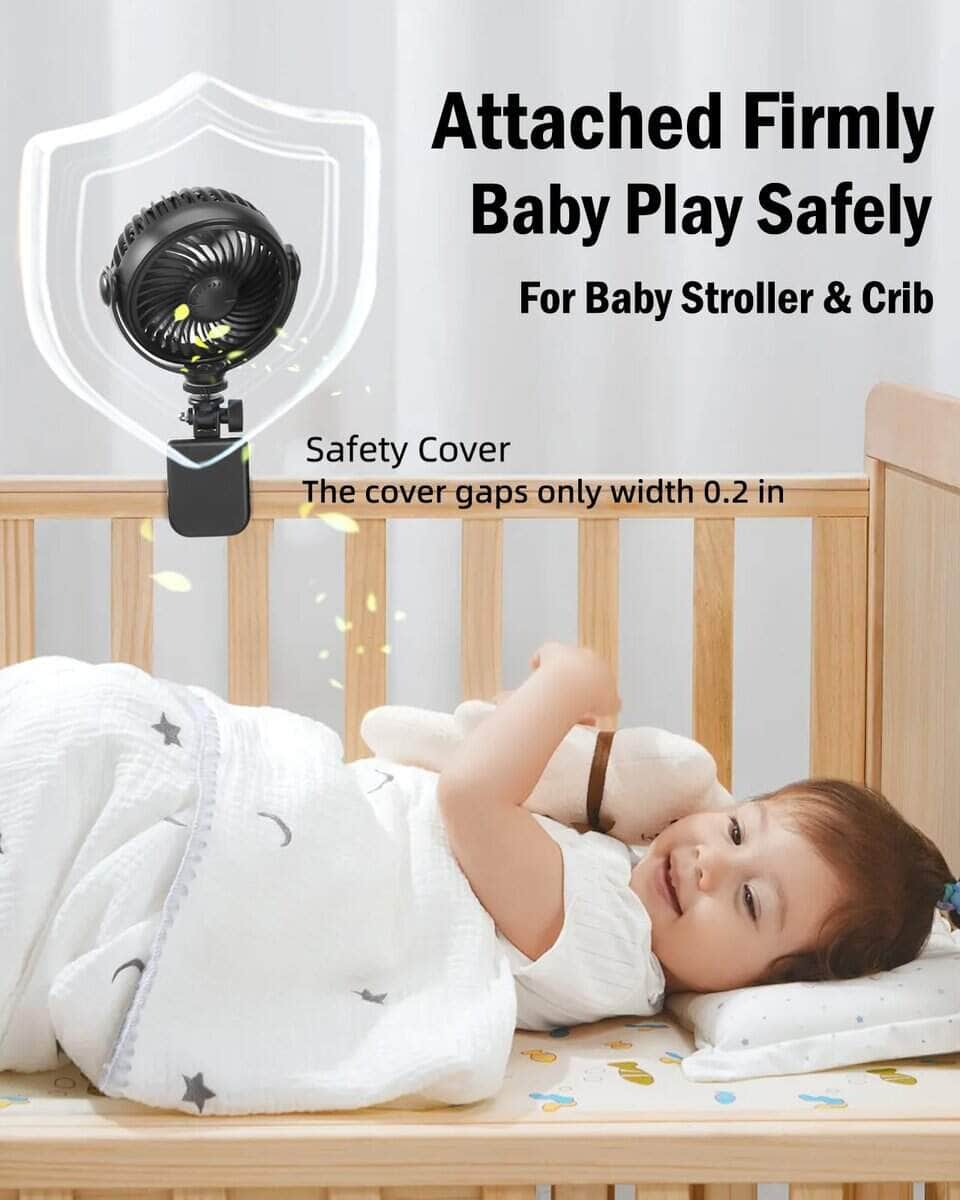 5. Seguridad para el Juego de Bebés: Nuestro ventilador para cochecito de bebé clip-on en bicicleta pelotón no tiene peligros para bebés. Una vez instalado el clip, siempre firme incluso si el bebé lo patea. Las cubiertas del ventilador están fijadas con tornillos y el bebé no tiene manera de quitarlas. Además, los huecos de la cubierta tienen solo 0.2 pulgadas, además de que todo el cuerpo es una bola redonda y suave. Por lo que el ventilador portátil para bebés xuenair nunca lastimaría los dedos del bebé o su piel delicada.