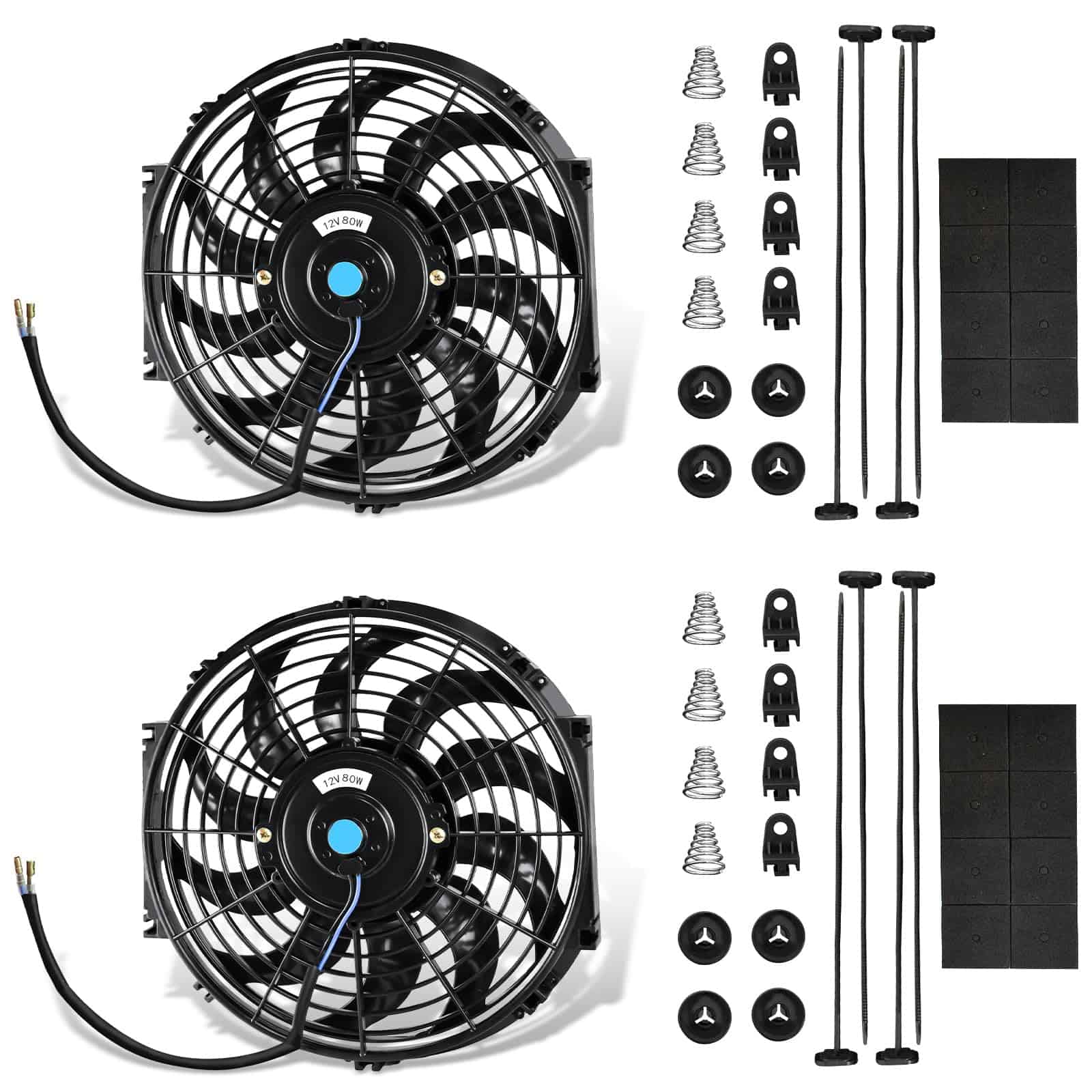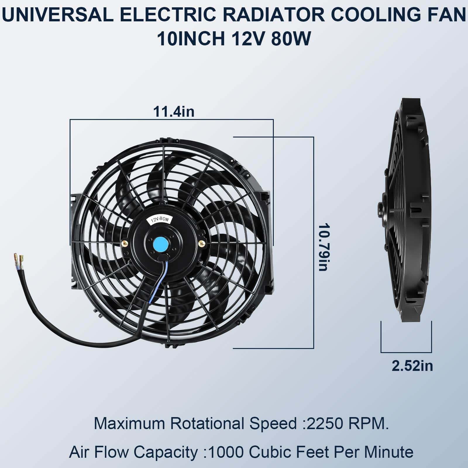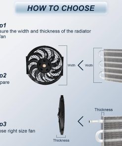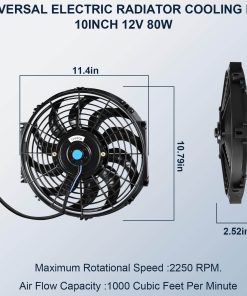1. Juego de 2 ventiladores de enfriamiento del motor del radiador MuHize de alto rendimiento con soportes de montaje y correas de sujeción. 12 Voltios 80 Vatios. Diámetro Total: 8.27″, Grosor: 2.64″. Consumo de Corriente: 5 amperios. Velocidad Rotacional Máxima: 2250 RPM. Velocidad del Viento Máxima: 1000 CFM.