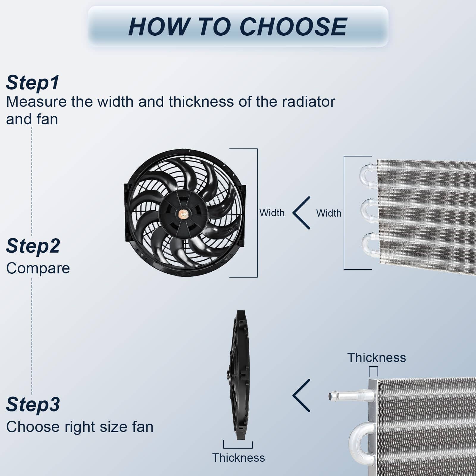 5. Amplia Aplicación Los ventiladores de enfriamiento universales para radiadores de MuHize son adecuados para la mayoría de vehículos y motores. El ventilador de enfriamiento de radiador eléctrico se utiliza para reemplazar las piezas originales del automóvil, mejorando la disipación de calor de maquinaria agrícola, de equipos, ventilación de invernaderos y ventilación de áticos.
