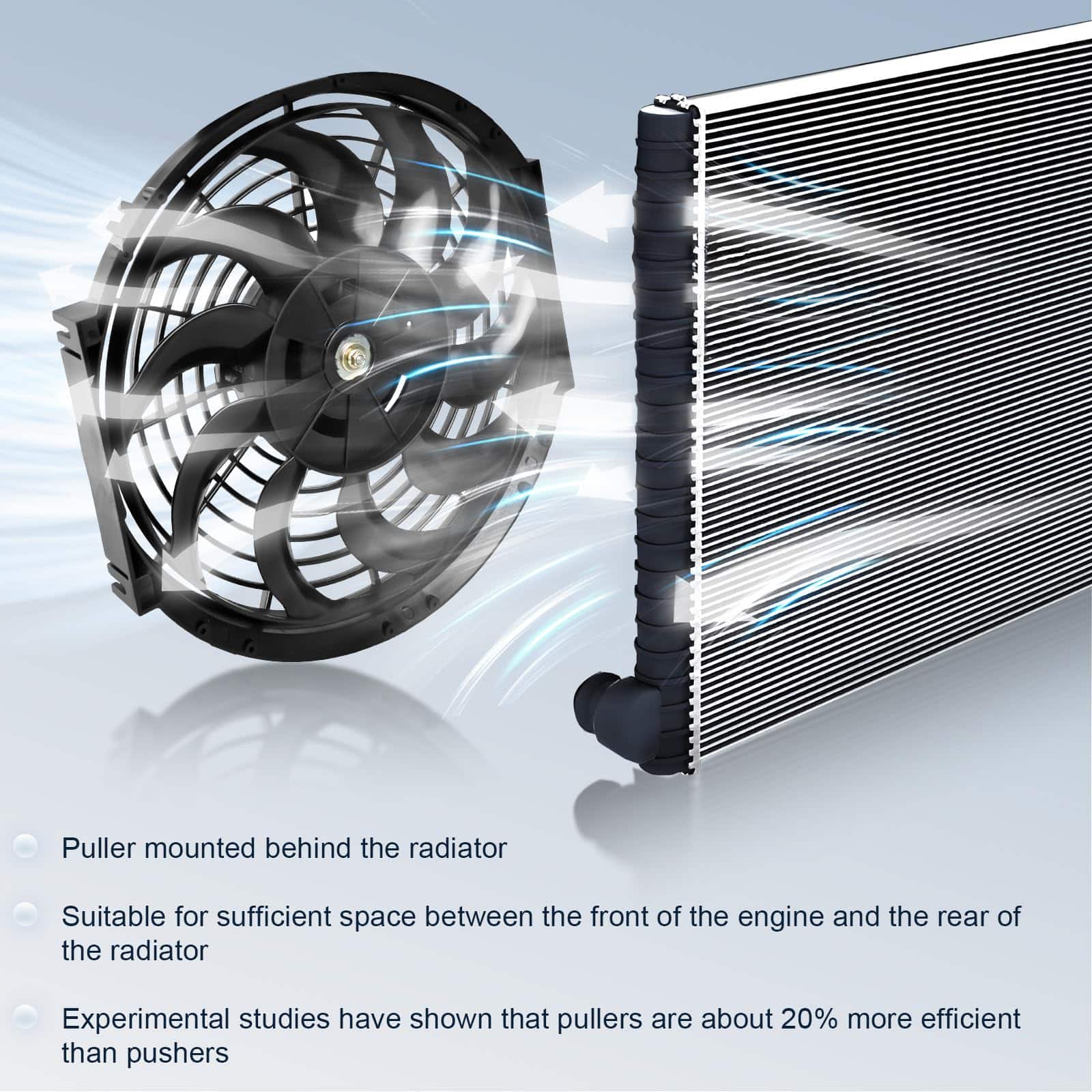 3. Diseño de Extracción Cuando se monta como un ventilador de tipo extracción, mueve una gran cantidad de aire y mantiene la transmisión a una temperatura sólida. Se adapta a radiadores, enfriadores de aceite, enfriadores de transmisión, condensadores y más.