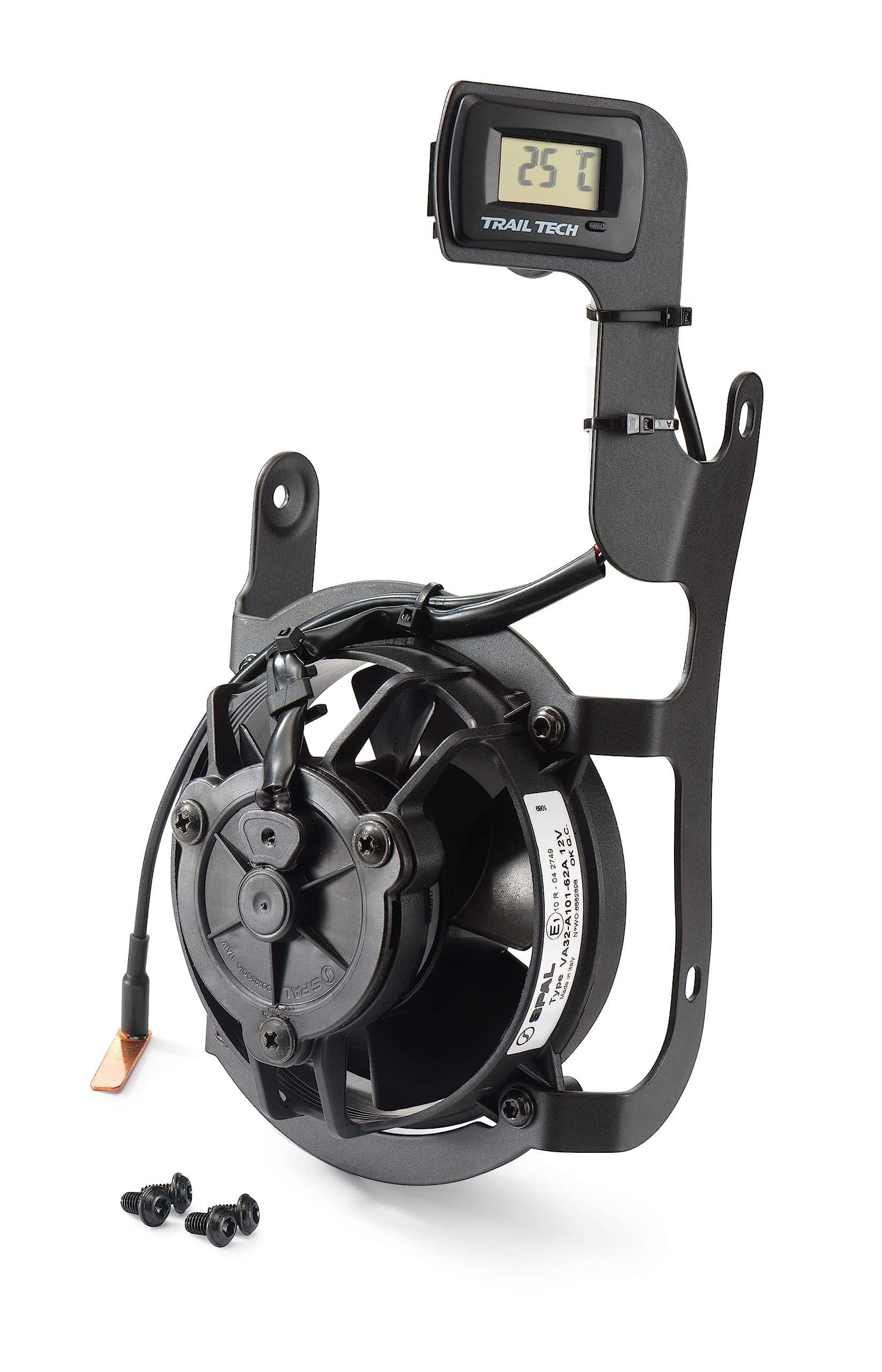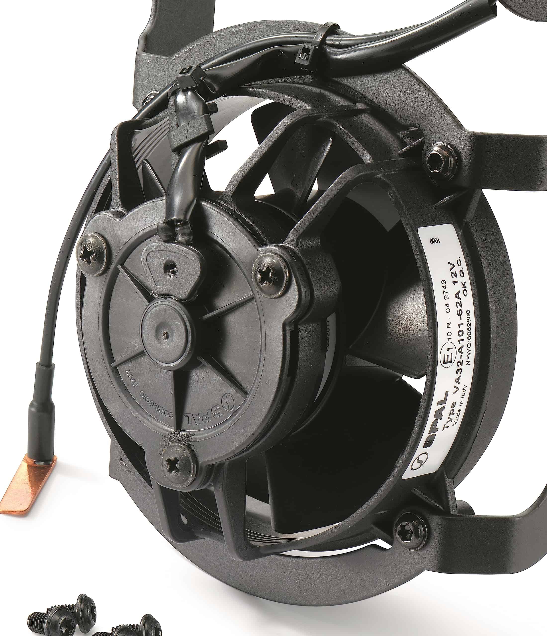 Proporciona más aire. Rendimiento máximo. Control digital. La temperatura actual se puede leer en cualquier momento. Temperatura de encendido variable entre 65 ºC y 95 ºC. Temperatura de apagado 1 ºC por debajo de la temperatura de encendido seleccionada. Proporciona una mejor refrigeración del motor. Se requiere arnés de cableado adicional (77711979000) que se vende por separado. Además, también recomendamos (pero no es obligatorio) el Distribuidor Y con interruptor integrado (77711979044). Esto le permite conectar dos consumidores de energía al arnés de cableado adicional. El consumidor de energía conectado se puede apagar para evitar que la batería se descargue cuando no esté en uso. Consulte a su distribuidor KTM para preguntas sobre la instalación.