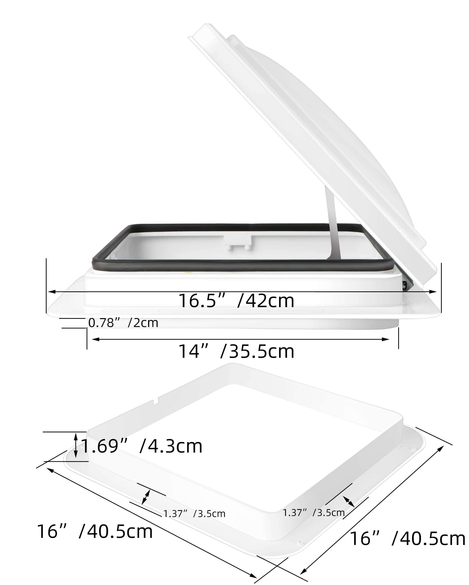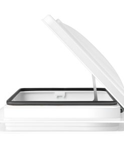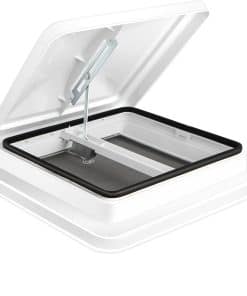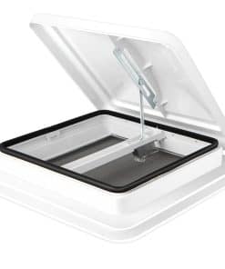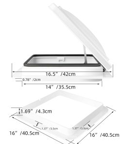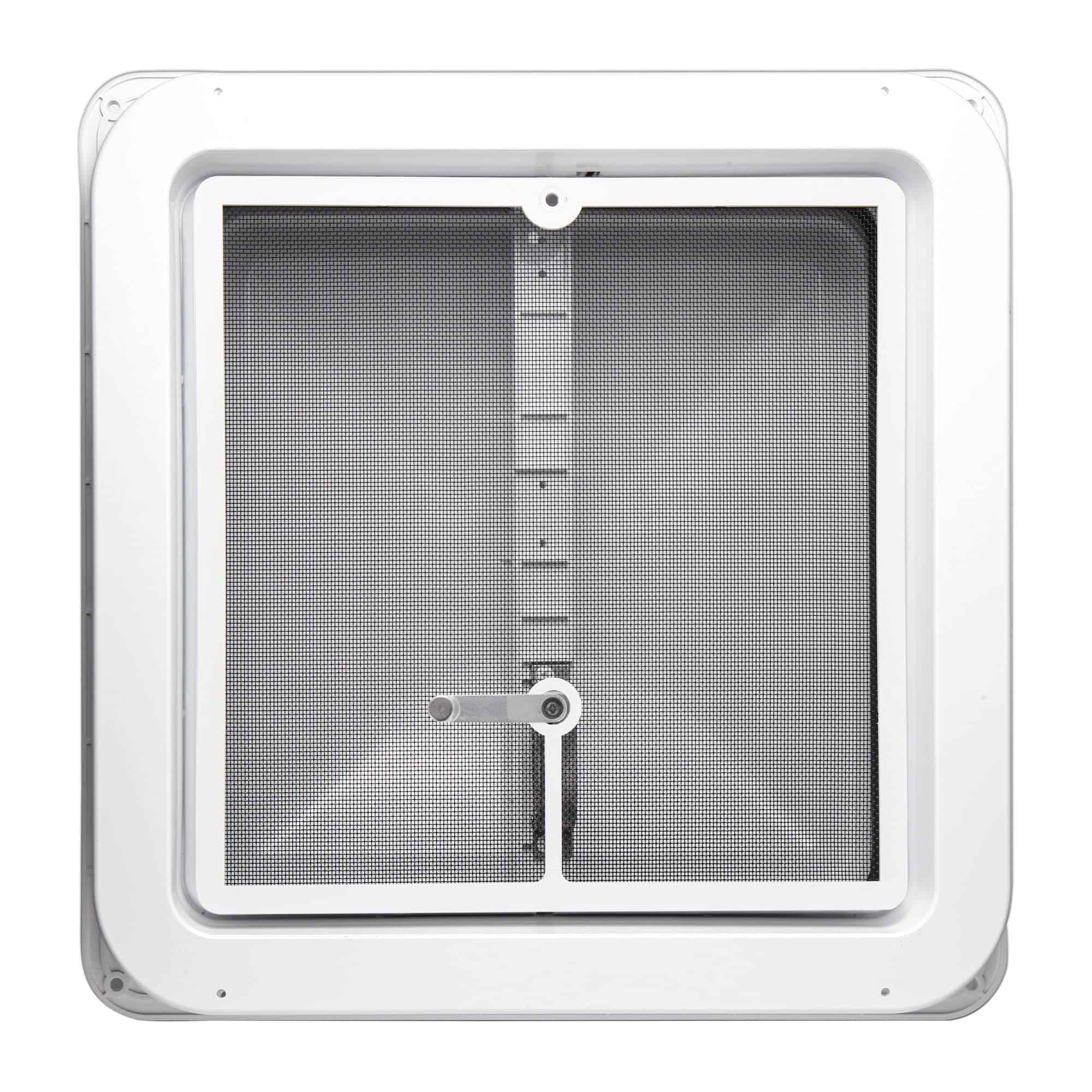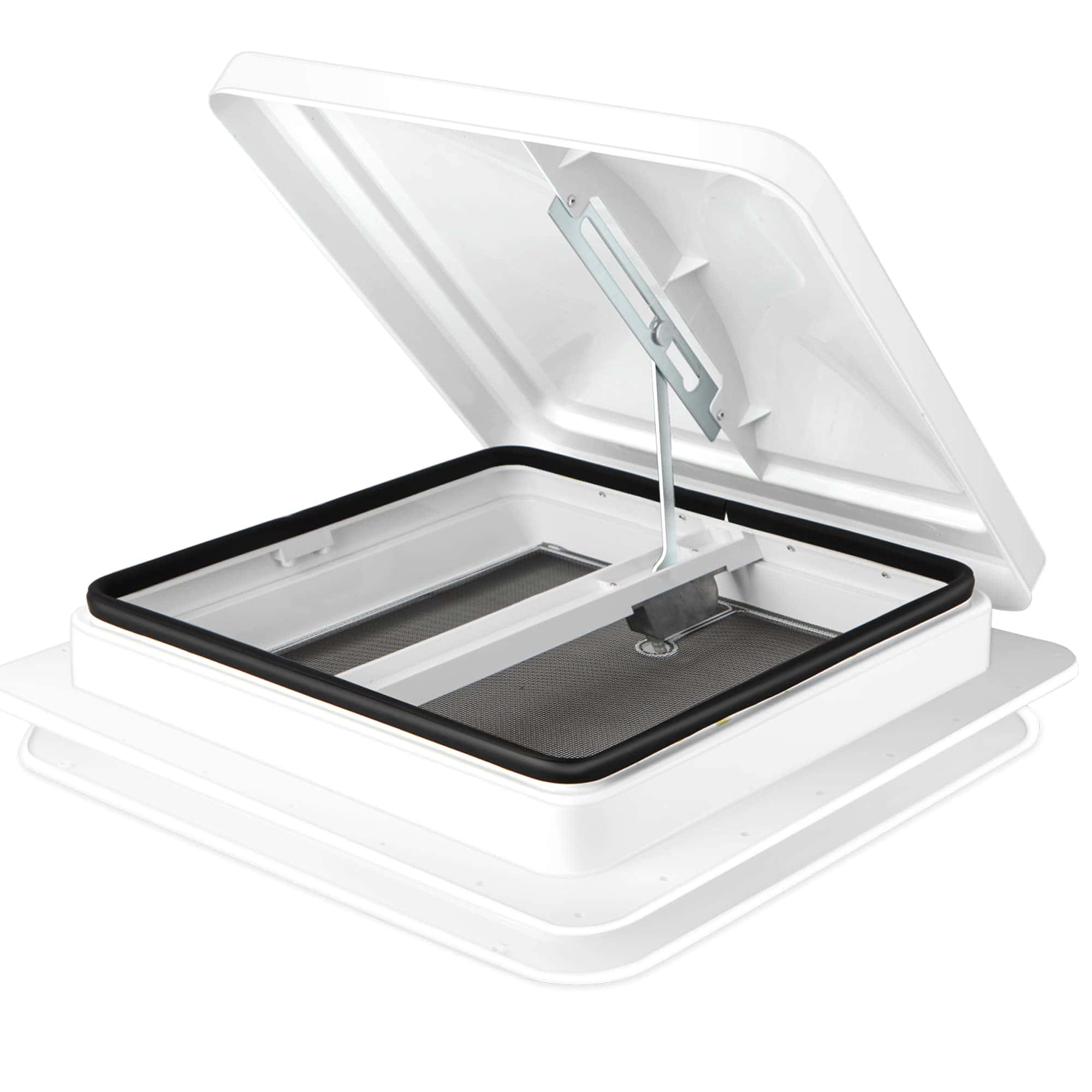 El ventilador de techo para RV o remolque de 14″ x 14″ permite que entre aire fresco y que escape el calor, mientras que el remolque o RV permanece cerrado y seguro. La tapa blanca translúcida deja pasar algo de luz. La manivela sencilla y de operación manual gira para abrir y cerrar la cúpula y elimina la necesidad de cableado. Incluye tornillos de montaje.