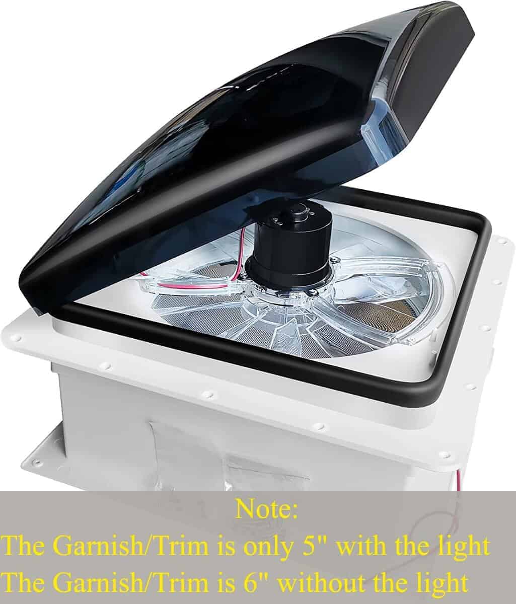 4. FÁCIL DE INSTALAR: Se adapta a todas las aberturas de techo ásperas de 14» x 14» pulgadas. Incorpora un fusible para protección del circuito y 2 fusibles lentos de 5A extras en el paquete. Incluye una pantalla adicional. Tornillos y guarnición interior blanca incluidos. Este ventilador de techo para RV puede ser instalado como ventilador de techo o ventilador de baño para tu vehículo recreativo.