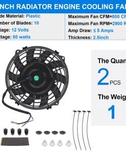 Este kit de 2 ventiladores de refrigeración del radiador del motor de 7 pulgadas FSBCGT es una solución de alto rendimiento para mantener su motor a la temperatura óptima. Con una potencia de 12V 80W, estos ventiladores pueden proporcionar una máxima CFM de 800 CFM y una máxima RPM del ventilador de 2900 10% RPM. Con un diseño delgado, estos ventiladores proporcionan una excelente distancia al vano del motor. La buena resistencia al calor y a la corrosión garantizan una larga vida útil para el radiador electrónico. El ventilador eléctrico del radiador de refrigeración es reversible, lo que significa que se puede utilizar como un empujador o un tirador, según sea necesario. Este ventilador universal se adapta a una variedad de vehículos y motores, siempre que coincida con el tamaño de su radiador. Siempre puede consultar la figura 4 para obtener instrucciones detalladas sobre cómo instalar y utilizar estos ventiladores. En caso de tener alguna pregunta o problema durante el uso, no dude en contactarnos y le proporcionaremos un servicio satisfactorio.