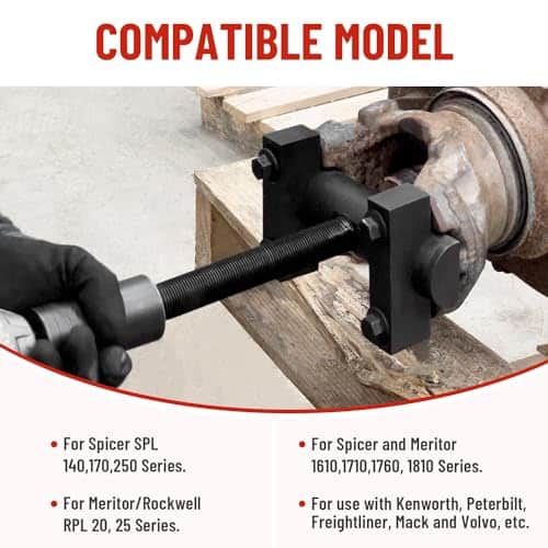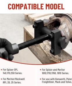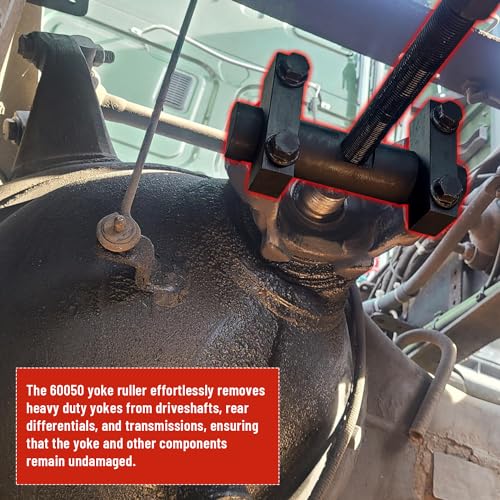 Extractor de Yugo Venussar 60050, una herramienta indispensable para la extracción de yugos de servicio pesado en transmisiones, árboles de transmisión y diferenciales traseros. Este extractor de yugo está diseñado para ajustarse a las series Spicer y Meritor 1610, 1710, 1760, 1810; Series Spicer SPL 140, 170, 250; Series Meritor/Rockwell RPL 20, 25, y es compatible con camiones de clase 6-8. Fabricado con materiales de alta calidad, incluido acero premium con recubrimiento en polvo negro que lo protege contra la corrosión. Con una capacidad para generar más de 25,000 libras de fuerza de tracción, este extractor de yugo es capaz de quitar fácilmente el yugo sin dañar las piezas circundantes. Adecuado para yugos con diámetros de rodamientos entre 1-7/8 pulgadas y 2-3/16 pulgadas, y viene con pernos de grado 8 resistentes. ¡Obtenga su extractor de yugo Venussar 60050 hoy y haga que la extracción de yugos sea rápida y sencilla!