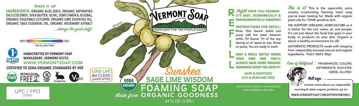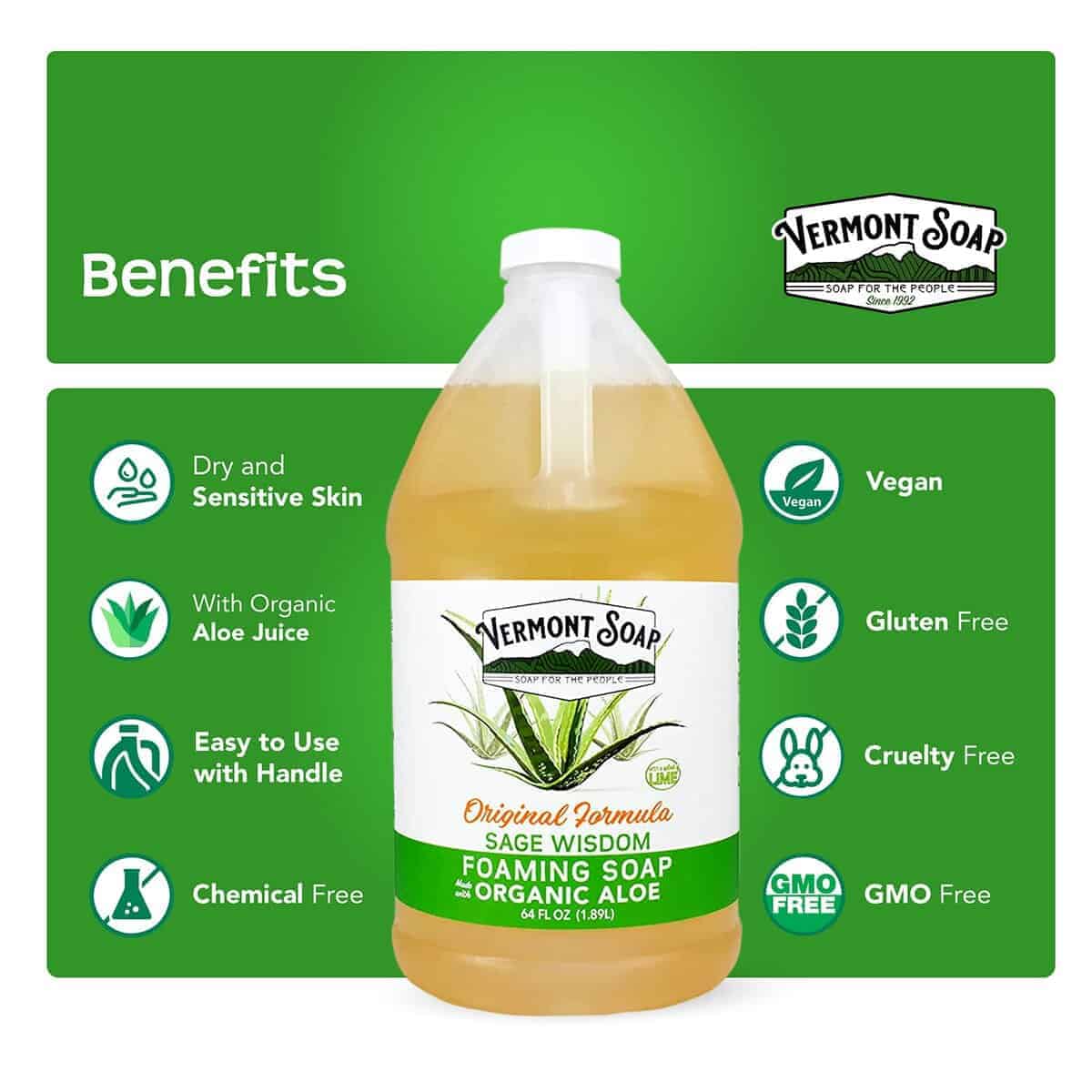 Características: Alivia las manos secas. Hidrata las manos. Para piel sensible. Dispensación sin esfuerzo. Paquete incluye: Vermont Hand Soap Sage Lime Wisdom – 64 oz x 1