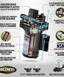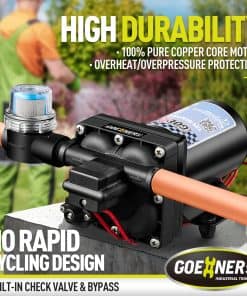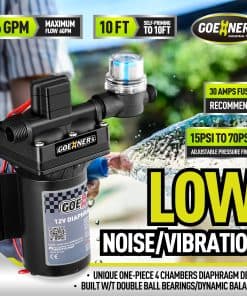 Versión actualizada Bomba de agua fresca para RV, bomba de agua de 12V DC, bomba de diafragma autoaspirante de 6.5GPM 70PSI con interruptor de presión y filtro para RV, embarcaciones, yates, caravanas. Este producto cuenta con especificaciones que incluyen un flujo de agua de 6.5 GPM, velocidad rápida a la que se libera el agua, interruptor de presión configurado a 70PSI, recomendación de utilizar un fusible de 25-30 amperios. Altura de autoaspiración de hasta 10 pies, autoaspiración horizontal de hasta 155 pies. Presión de encendido es de 25-30psi (casa general) / 30-40psi (RV grande), presión de apagado es de 70psi, presión de derivación es de 85-90psi. Esta bomba es ideal para RV, yates, jardín, campistas. Diseño de bajo ruido con rodamientos de bolas dobles NSK y diafragma de 4 cámaras en una sola pieza garantiza un alto flujo y funcionamiento silencioso. Incorpora interruptor de presión que proporciona un inicio y parada automática. Garantía de fábrica de 3 años para este producto de alta calidad.