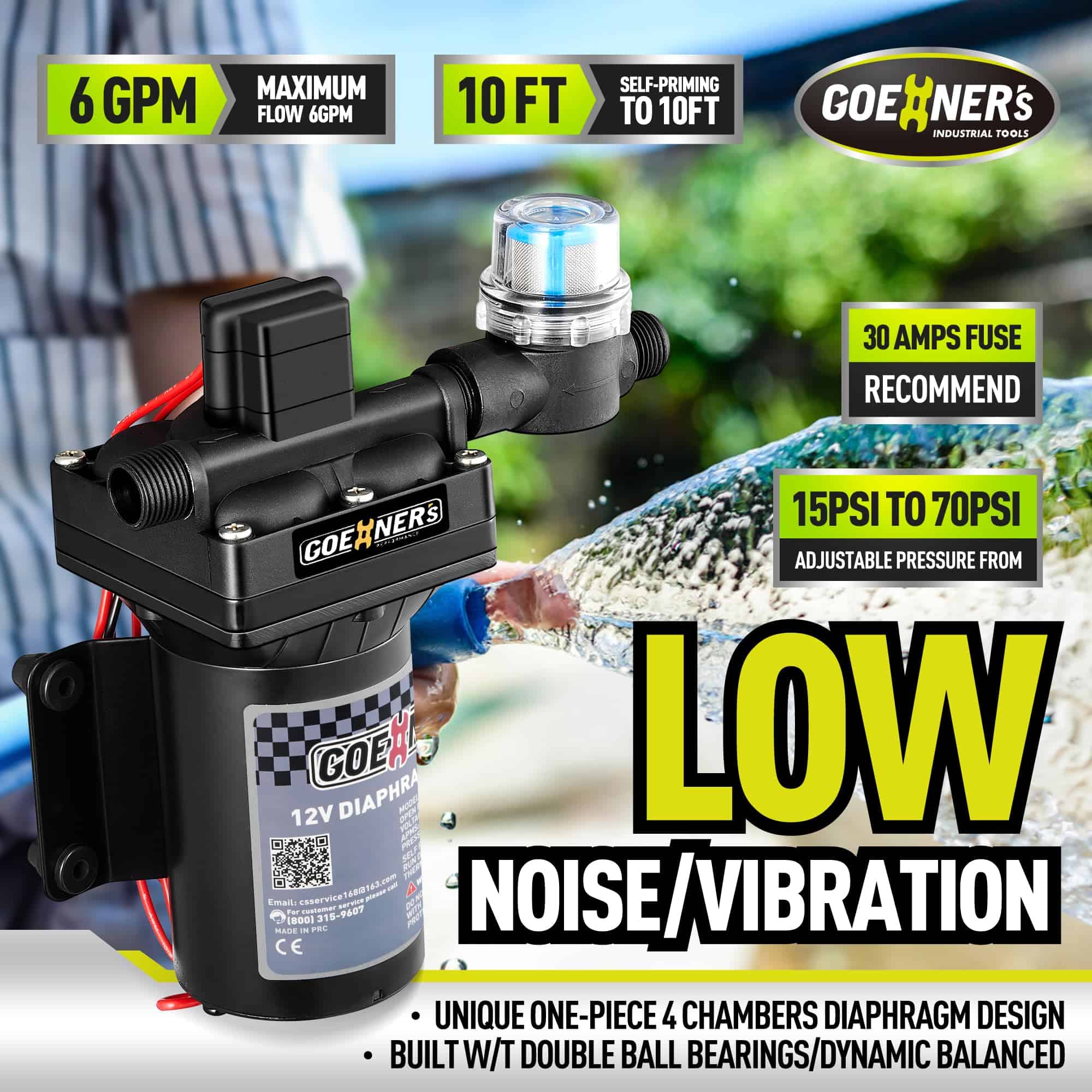 Versión actualizada Bomba de agua fresca para RV, bomba de agua de 12V DC, bomba de diafragma autoaspirante de 6.5GPM 70PSI con interruptor de presión y filtro para RV, embarcaciones, yates, caravanas. Este producto cuenta con especificaciones que incluyen un flujo de agua de 6.5 GPM, velocidad rápida a la que se libera el agua, interruptor de presión configurado a 70PSI, recomendación de utilizar un fusible de 25-30 amperios. Altura de autoaspiración de hasta 10 pies, autoaspiración horizontal de hasta 155 pies. Presión de encendido es de 25-30psi (casa general) / 30-40psi (RV grande), presión de apagado es de 70psi, presión de derivación es de 85-90psi. Esta bomba es ideal para RV, yates, jardín, campistas. Diseño de bajo ruido con rodamientos de bolas dobles NSK y diafragma de 4 cámaras en una sola pieza garantiza un alto flujo y funcionamiento silencioso. Incorpora interruptor de presión que proporciona un inicio y parada automática. Garantía de fábrica de 3 años para este producto de alta calidad.