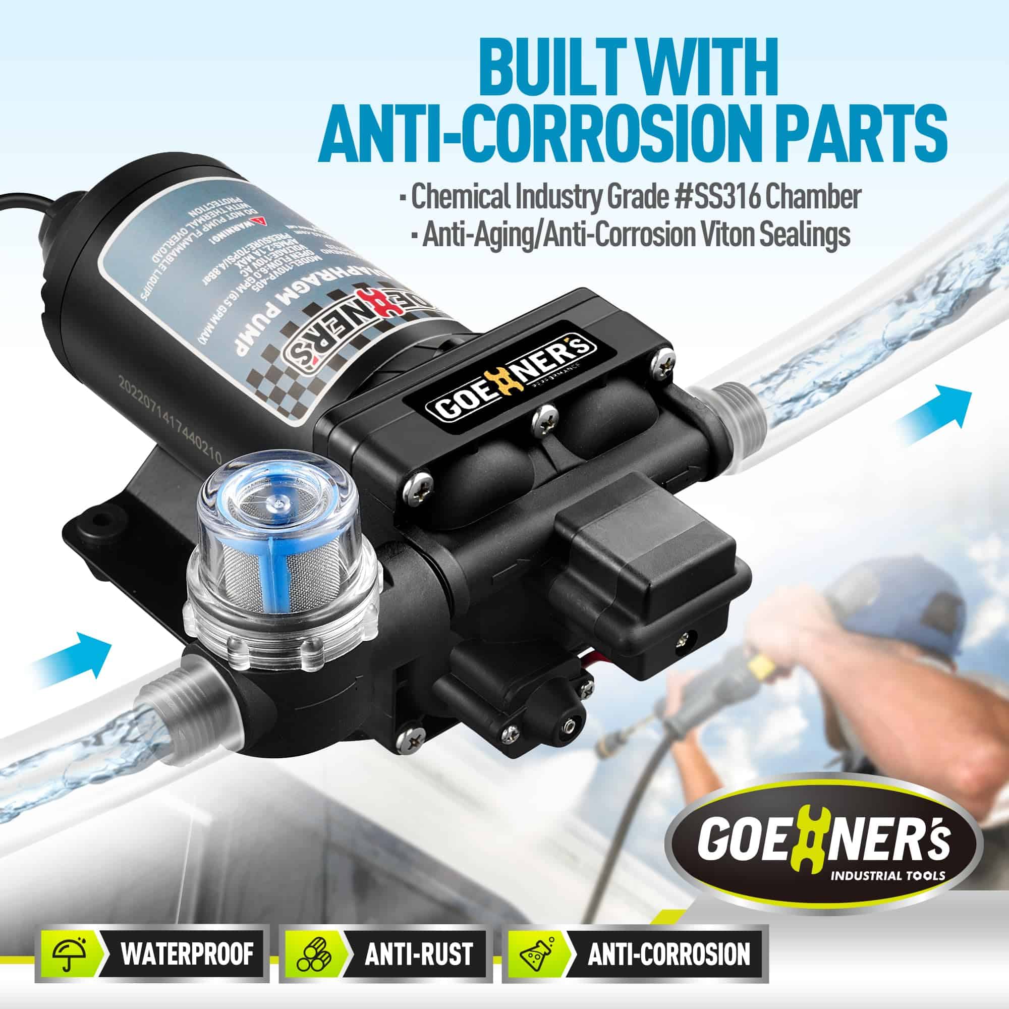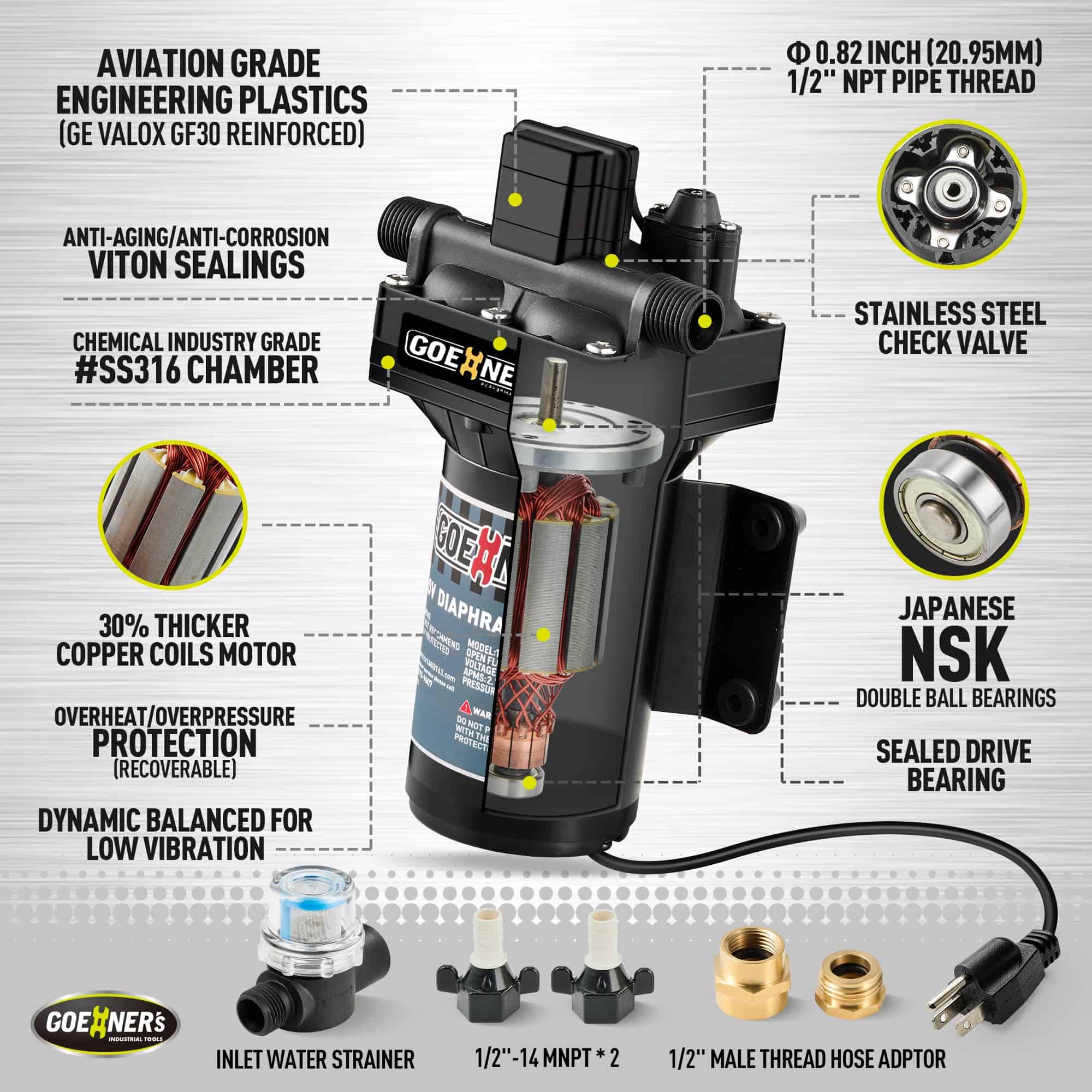 Bomba de Agua 110V AC Versión Mejorada, 6.5GPM 70 PSI Autocebante de Diafragma con Enchufe de Corriente, Interruptor de Presión, Conector de Latón y Colador, para Cocina Baño Manguera de Jardín. Su diseño de Bajo Ruido lo hace ideal para diversas aplicaciones como presurización de agua, lavado de autos, grifos, duchas, riego agrícola, transporte de líquidos no inflamables, riego y pulverización de jardines, etc. Viene con una garantía de fábrica de 3 años.