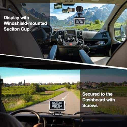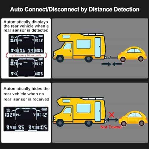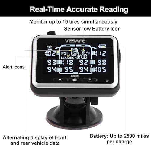 VESAFE TPMS observa hasta 22 neumáticos en total con 5 modos de alarma en presión de neumáticos alta/baja, temperatura, fuga de neumáticos y vida útil de la batería. Los valores de alerta son ajustables según sus necesidades. La alarma se activará cuando la presión de los neumáticos sea más alta o más baja que los valores preestablecidos. El monitor muestra datos precisos en tiempo real de cada neumático durante 5 segundos mientras se desplaza por todos los neumáticos conectados. Una advertencia audible y visible se activará cuando ocurran condiciones anormales. El monitor es compatible con la conducción de hasta 5,000 millas con una carga completa. Los sensores de neumáticos son antirrobo y duraderos con una vida útil de la batería de hasta 2 años. Las baterías son reemplazables una vez agotadas. El monitor se conecta/desconecta automáticamente mediante la detección de movimiento o puede despertarlo tocando la pantalla. Para vehículos de remolque con remolque, el TPMS se conecta/desconecta automáticamente mediante la detección de distancia. Se recomienda un amplificador de señal para reducir la interferencia entre los sensores y el monitor. No dude en obtener soporte profesional de VESAFE para cualquier problema.