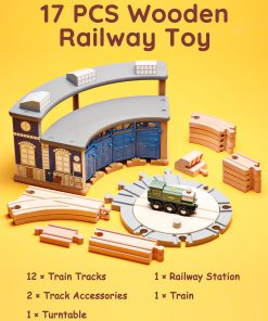 17 piezas de juguete ferroviario de madera que incluyen 12 vías de tren, 1 estación de tren, 1 tren, 1 plato giratorio y 2 accesorios de pista