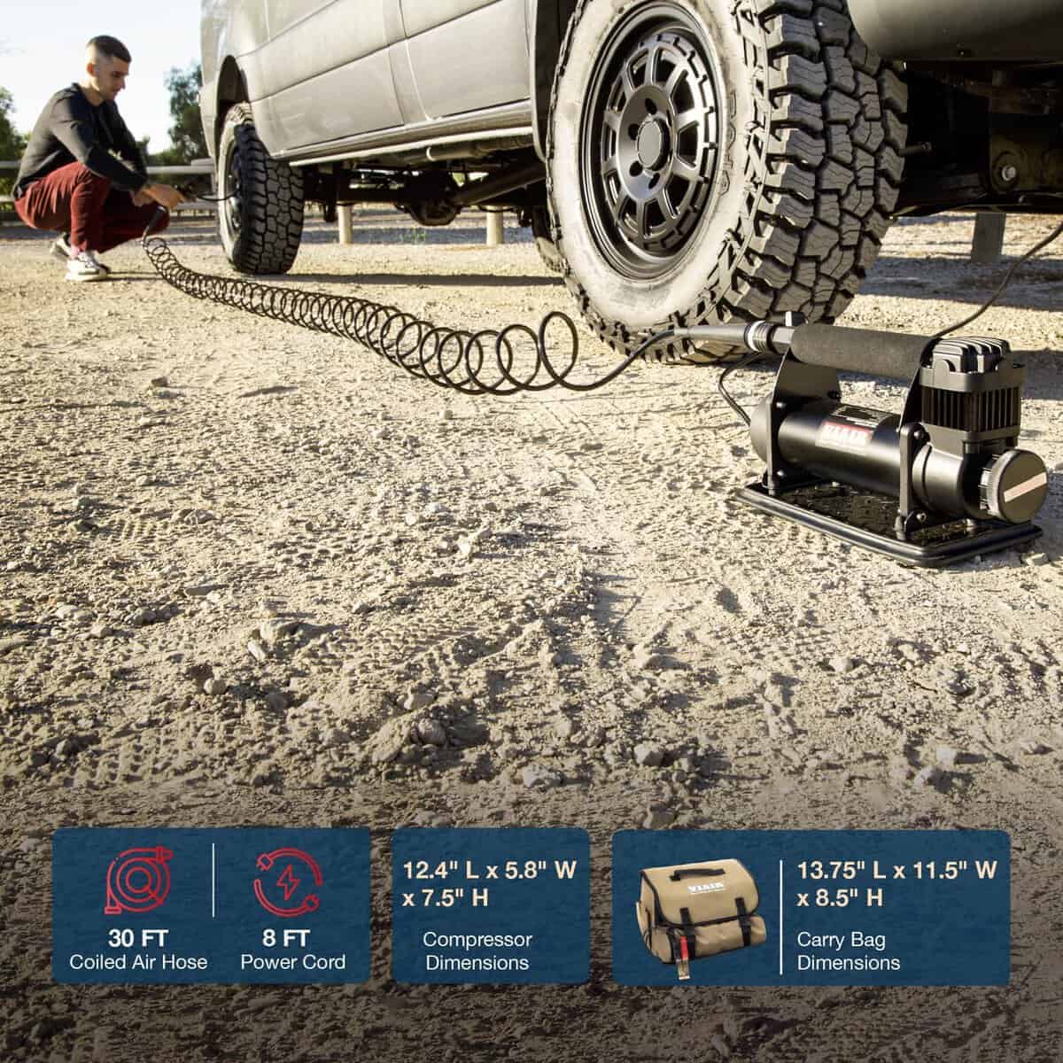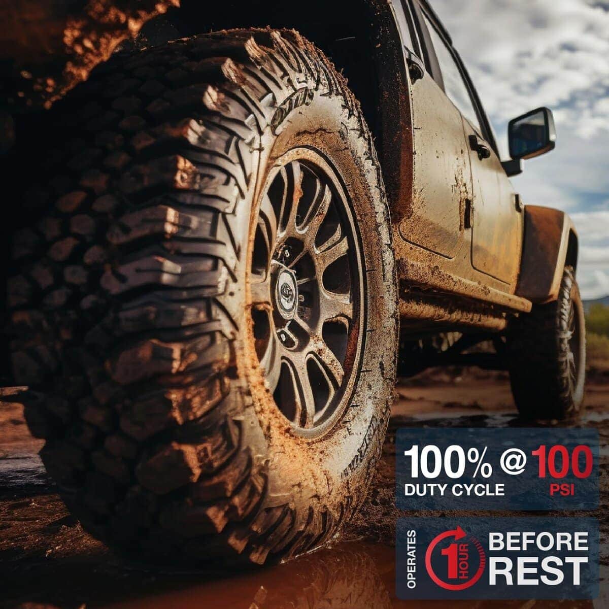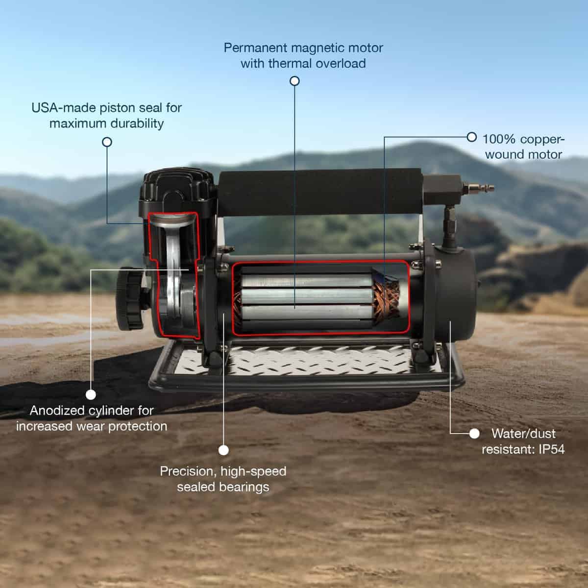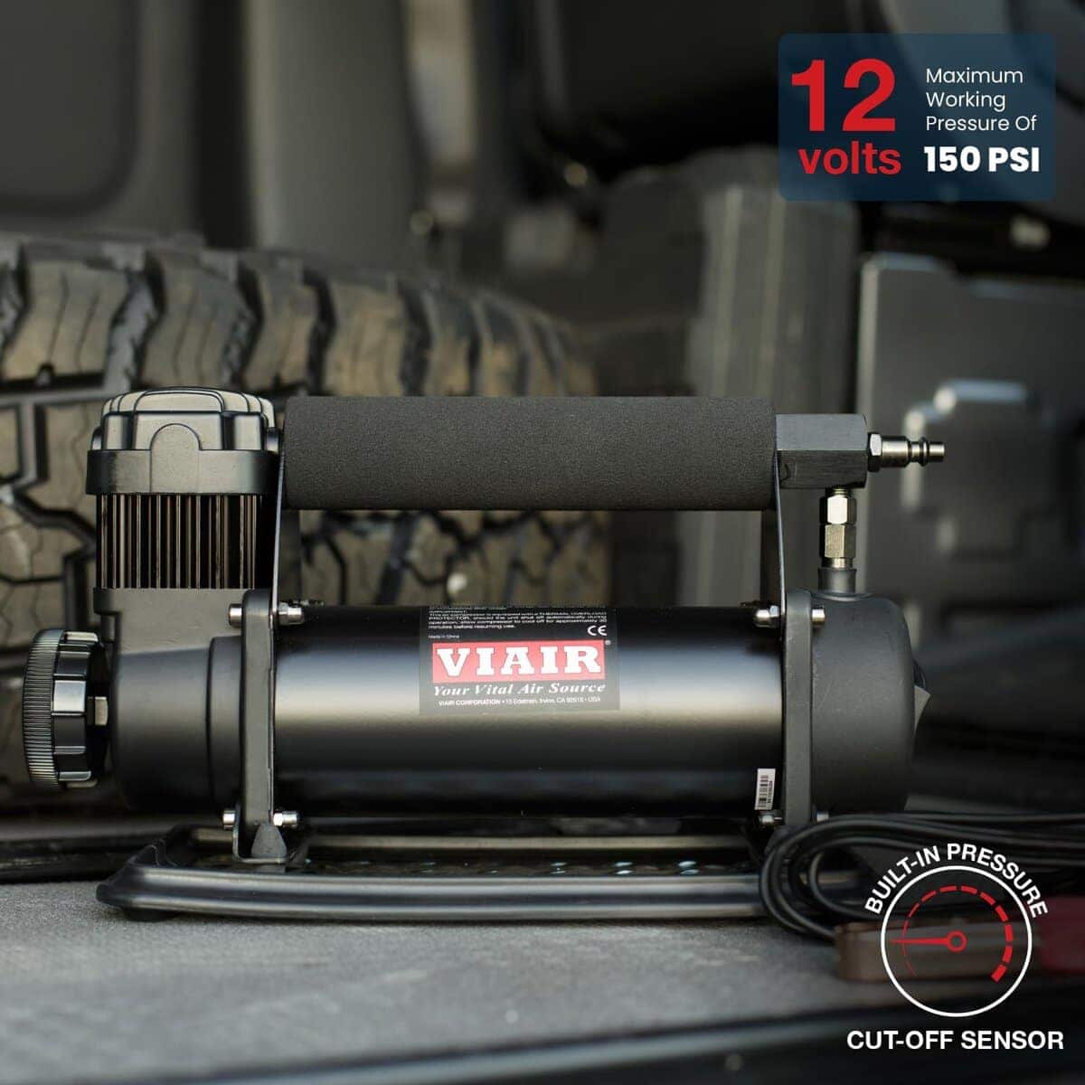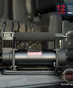 Esté preparado para emergencias de neumáticos con el Compresor Portátil Automático VIAIR 450P, el último kit de inflado automático de neumáticos que asegura la confiabilidad ya sea que esté inflando después de un viaje todoterreno o enfrentando una situación de neumático desinflado inesperada. Diseñado para camionetas, jeeps y SUVs con tamaños de neumáticos de hasta 42″, esta bomba de aire portátil garantiza tranquilidad en cada aventura en carretera. El compresor de aire portátil automático es ideal para transiciones de neumático a neumático o cuando desea verificar la presión a mitad de inflado. Al eliminar el encendido y apagado manual y simplificar el proceso de inflado, nuestra bomba de aire ayudará a aumentar la eficiencia y le ayudará a volver a la carretera rápidamente. El kit viene con una pistola de aire estilo de gasolinera con extremo cerrado para mayor conveniencia. La bolsa de transporte de lujo de doble compartimento, incluida con el kit de compresor de aire, mejora la portabilidad y la capacidad de almacenamiento, asegurando que ya no habrá más problemas durante situaciones de emergencia. El kit de inflado de neumáticos funciona con 12 voltios, entregando una presión máxima de trabajo de 150 PSI y un ciclo de trabajo del 100%; la capacidad de flujo libre es de 1.80 CFM. El compresor de aire automático funciona hasta 1 hora seguida antes de necesitar un descanso. El motor debe estar en marcha durante el uso para una operación sin problemas.