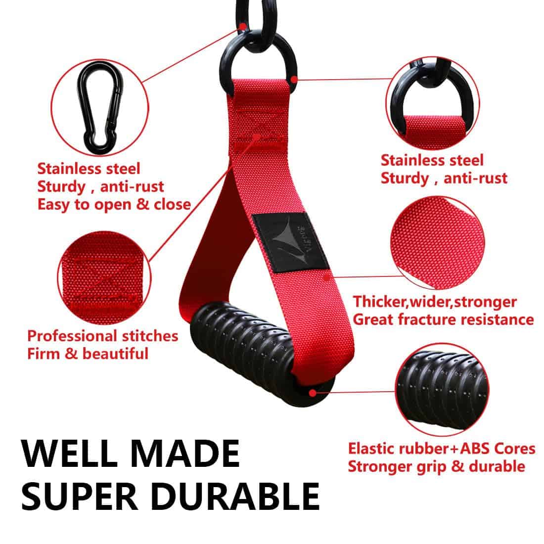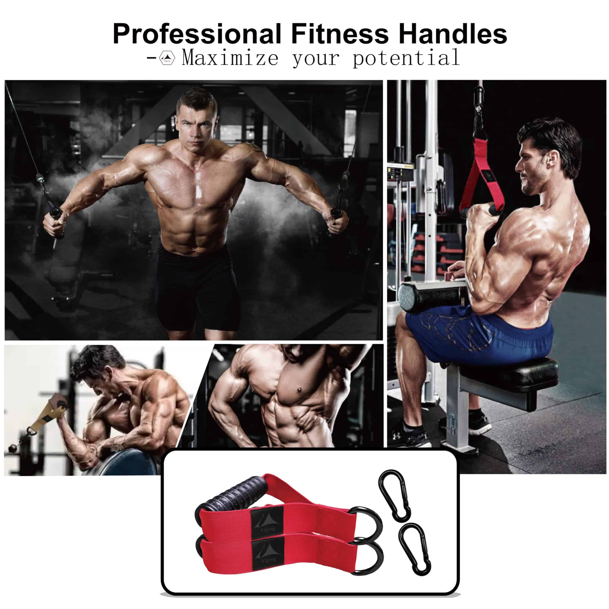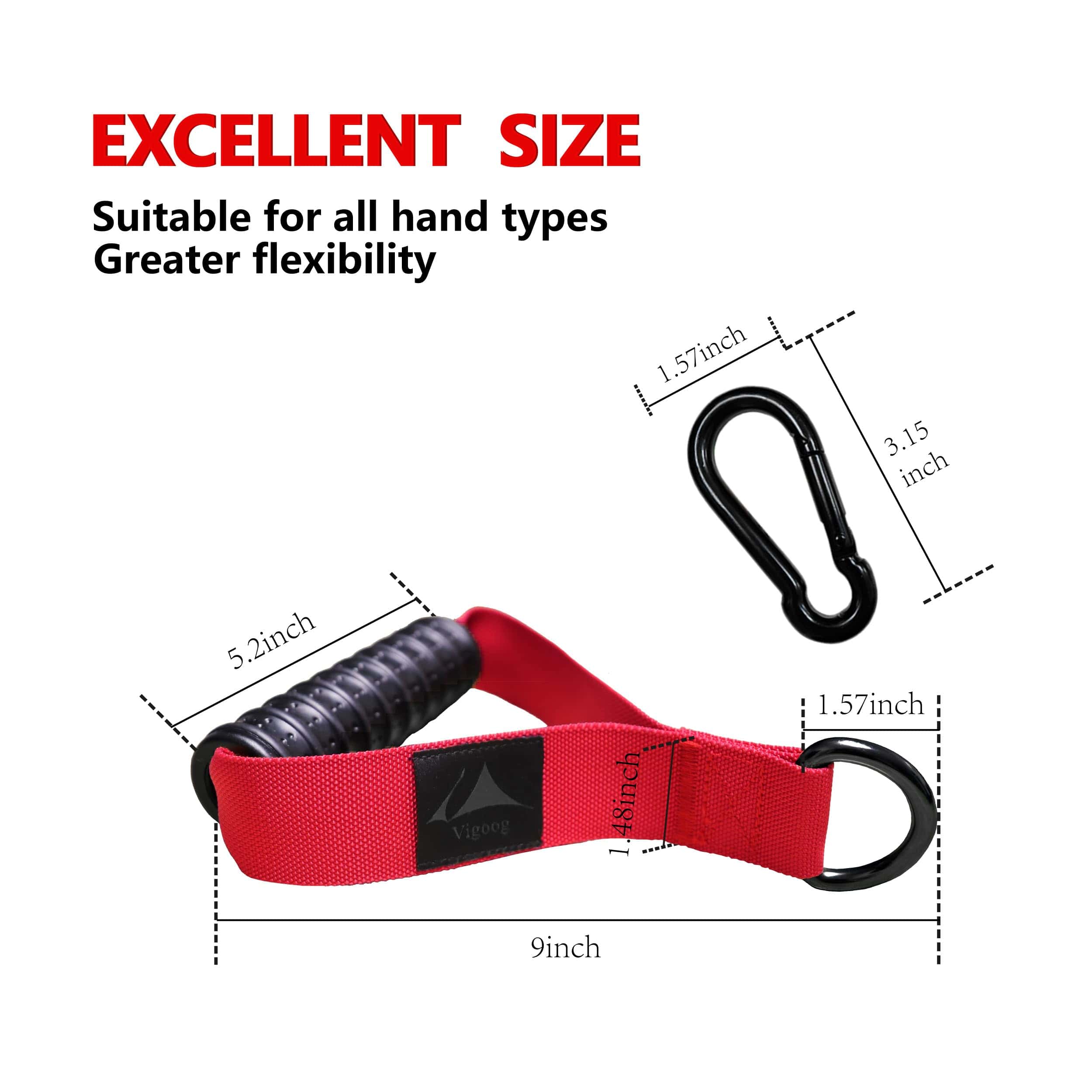 1. Material resistente y duradero: Vigoog analizó los defectos de los mangos tradicionales y los comentarios de los consumidores, y utilizó agarres de goma elástica sólida + banda de cifrado más ancha + fuerte anillo en D grande para fabricar, más duradero y seguro, asegurando un rendimiento duradero en el ejercicio a largo plazo.