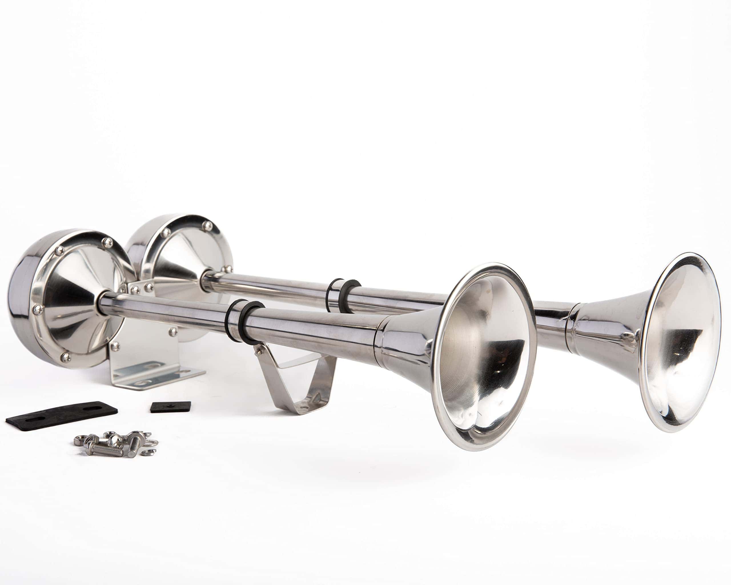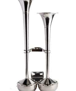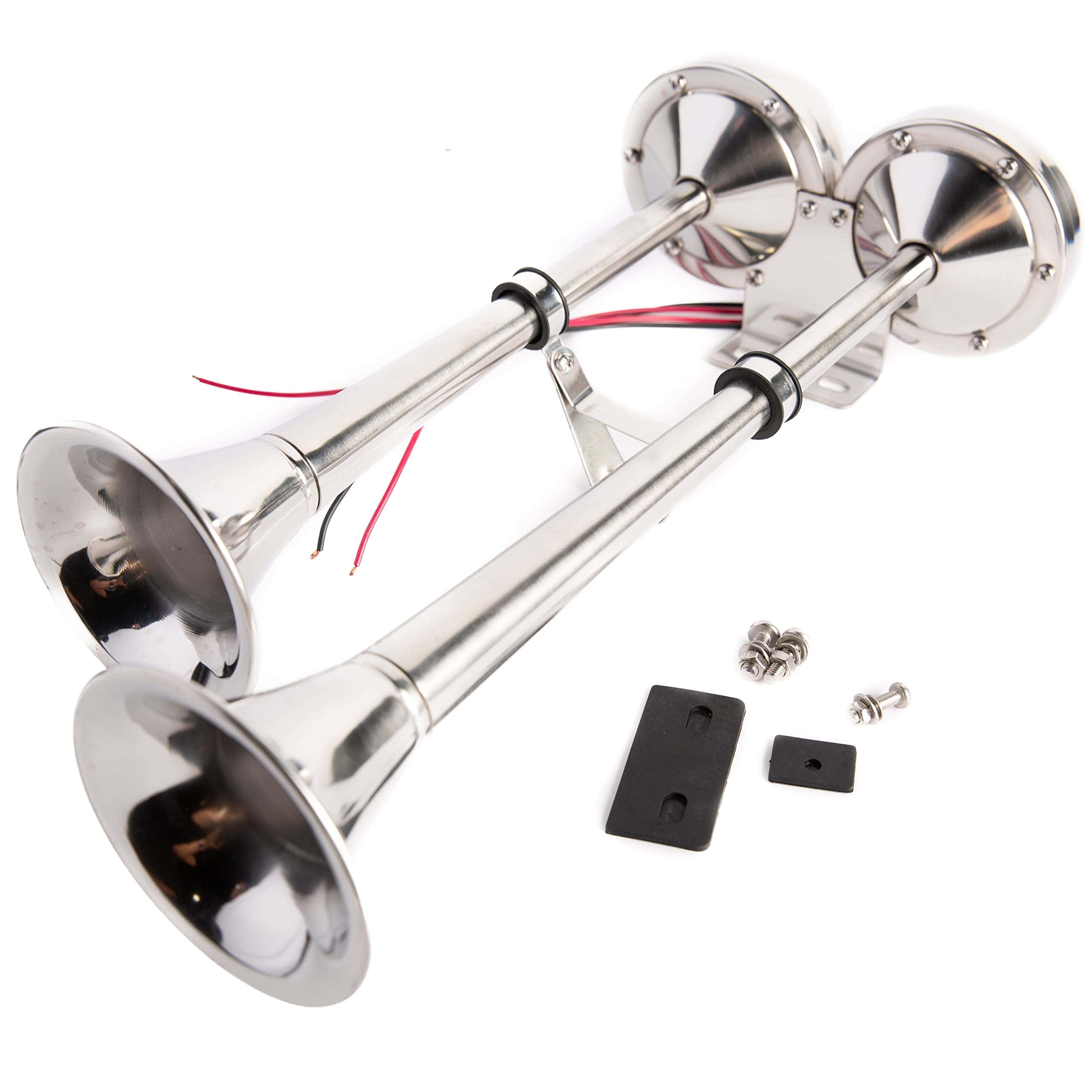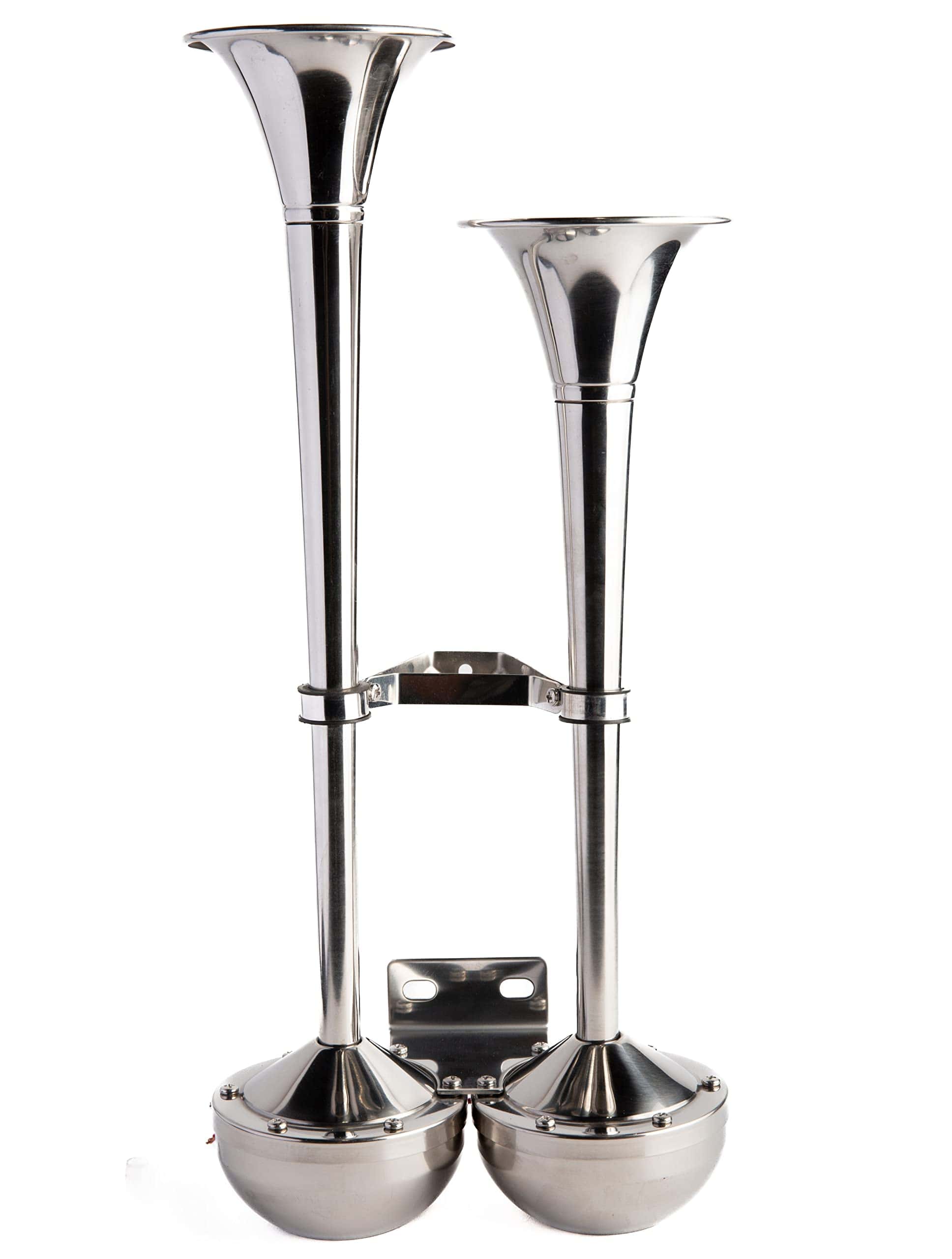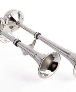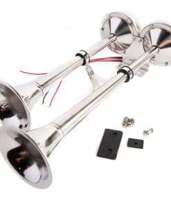 Este claxon eléctrico de doble trompeta está fabricado al 100% en acero inoxidable, grado 304 no magnético con un acabado pulido brillante que no se oxida. Diseñado para uso exterior y es ideal para barcos en un ambiente de agua salada y también para RV’s, SUV’s y camiones. Sonará a un alto nivel de 125db. Ideal para vehículos con sistema de 12 voltios en casi cualquier condición climática. Este claxon es libre de mantenimiento y no requiere compresor ni mangueras. Conexión simple de 2 cables (positivo y negativo) para una instalación rápida. Dimensiones de las trompetas del claxon: 13-1/2″ y 15-1/2″ de largo. IMPORTANTE: Mientras el claxon esté fuera de uso, DEBE realizar una limpieza interna de las trompetas antes de guardarlo.
