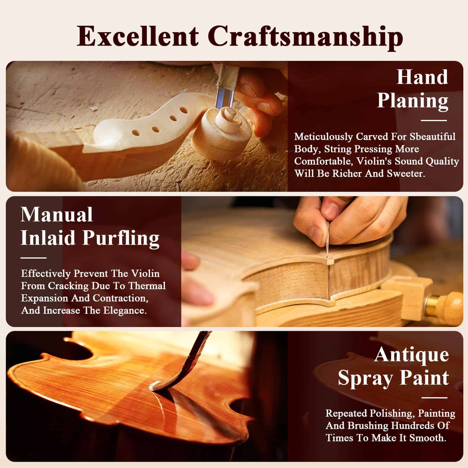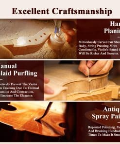 VIOLÍN PHOENIX 4/4 Tamaño Completo Set, Violín de Madera Maciza para Principiantes Profesionales Adultos Niños con Arco Octogonal de Palo de Hierro y Arco de Palo de Rosa Cuerdas y Puente Extra, 2 Colofonias, Afinador, Sordina, Estuche (Natural, Completo). Detalles del producto: 1. Violín de Madera Europea: Madera de abeto y arce de alta calidad cuidadosamente seleccionada de los Alpes. Proveniente de la selección tradicional de materiales y técnicas de producción de la familia Stradivari italiana. Sin nudos, reparaciones ni agujeros de insectos. Los tendones de madera son verticales y uniformes. Los rayos de sonido son excelentes y la pronunciación es altamente sensible. 2. Artesanía a mano cuidadosa: El violín PHOENIX se basa en el proceso de producción tradicional del modelo Stradivarius italiano. Todo se hace a mano, desde la producción de la pala, el tablero de piano, el oído en forma de F y el refuerzo interno hasta el pulido y la pintura. El rango de error técnico se controla estrictamente dentro de los 0.1mm, por lo que el cuerpo del violín tiene líneas suaves, una sensación suave y una pronunciación estable y hermosa. 3. Toca de inmediato: Cuando se envía el violín, el puente está instalado, las cuerdas están ajustadas al tono estándar y el arco está frotado con colofonia. Después de recibir el producto, se puede utilizar de inmediato con una sencilla puesta a punto. Permite alcanzar el pico de la experiencia de compra y uso del violín. 4. Una experiencia de juego diferente: El violín PHOENIX presta una atención sin precedentes a la sensación de juego y la calidad del sonido. La altura del puente y la distancia entre las cuerdas se ajustan profesionalmente según las características de transmisión del sonido de la madera y la amplitud de vibración de las cuerdas, haciendo que la presión de las cuerdas sea más cómoda. Junto con cuerdas cuidadosamente seleccionadas, la calidad del sonido del violín será más rica y dulce, y el tono será más rico y suave. 5. Accesorios de alta calidad: El set de violín de tamaño completo PHOENIX incluye: Arco octogonal de palo de hierro, Palillo de madera de palo de rosa, Afinador de clip, Sordina, Pegatina transparente del diapasón, Reposapiés, Correas, Set de cuerdas extra (4 cuerdas más 1 cuerda E, un total de 5 raíces), Colofonias 2, Puente extra, Estuche de violín ecológico de alta gama, Paño de limpieza, Tutorial en inglés. Los accesorios de alta calidad mejoran tu sensación de juego. ¡Aumenta tu pasión por la música con el Violín PHOENIX! Valor garantizado en cada nota.