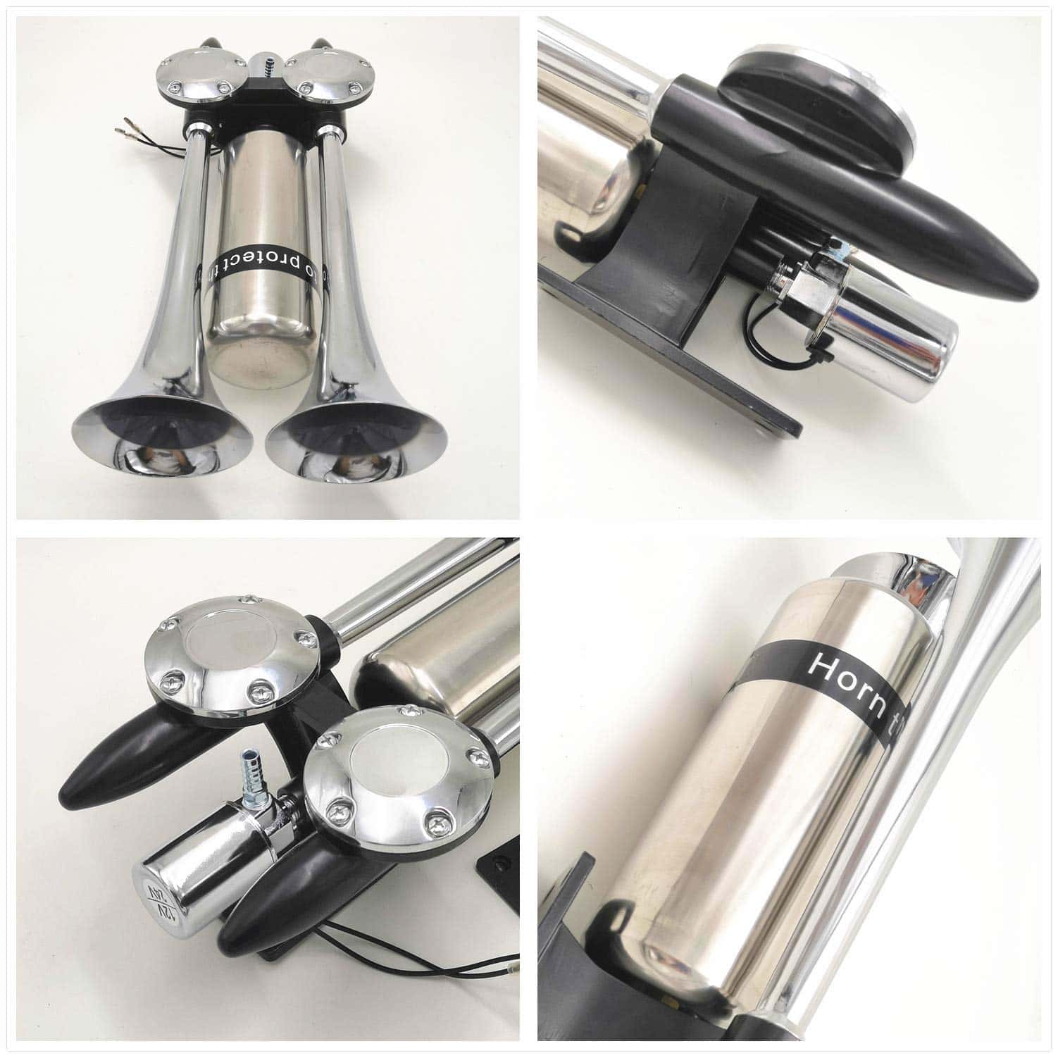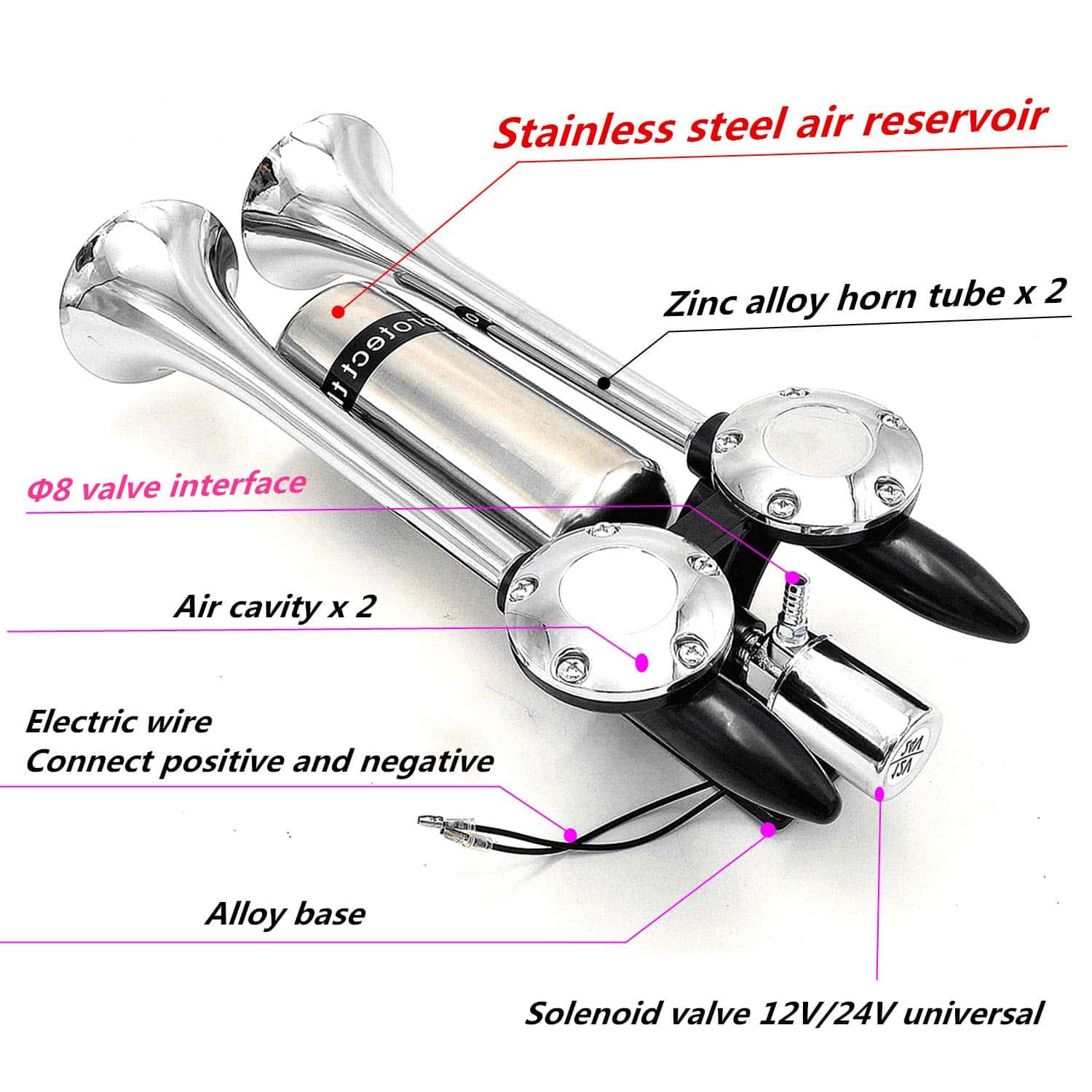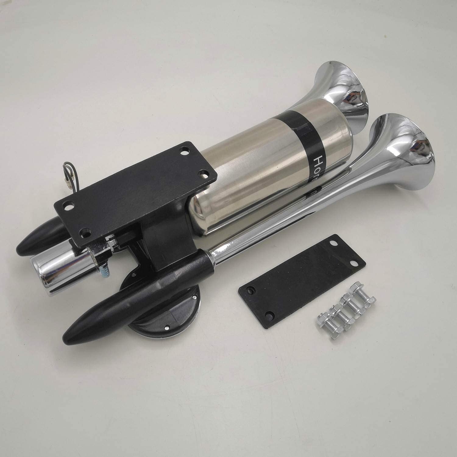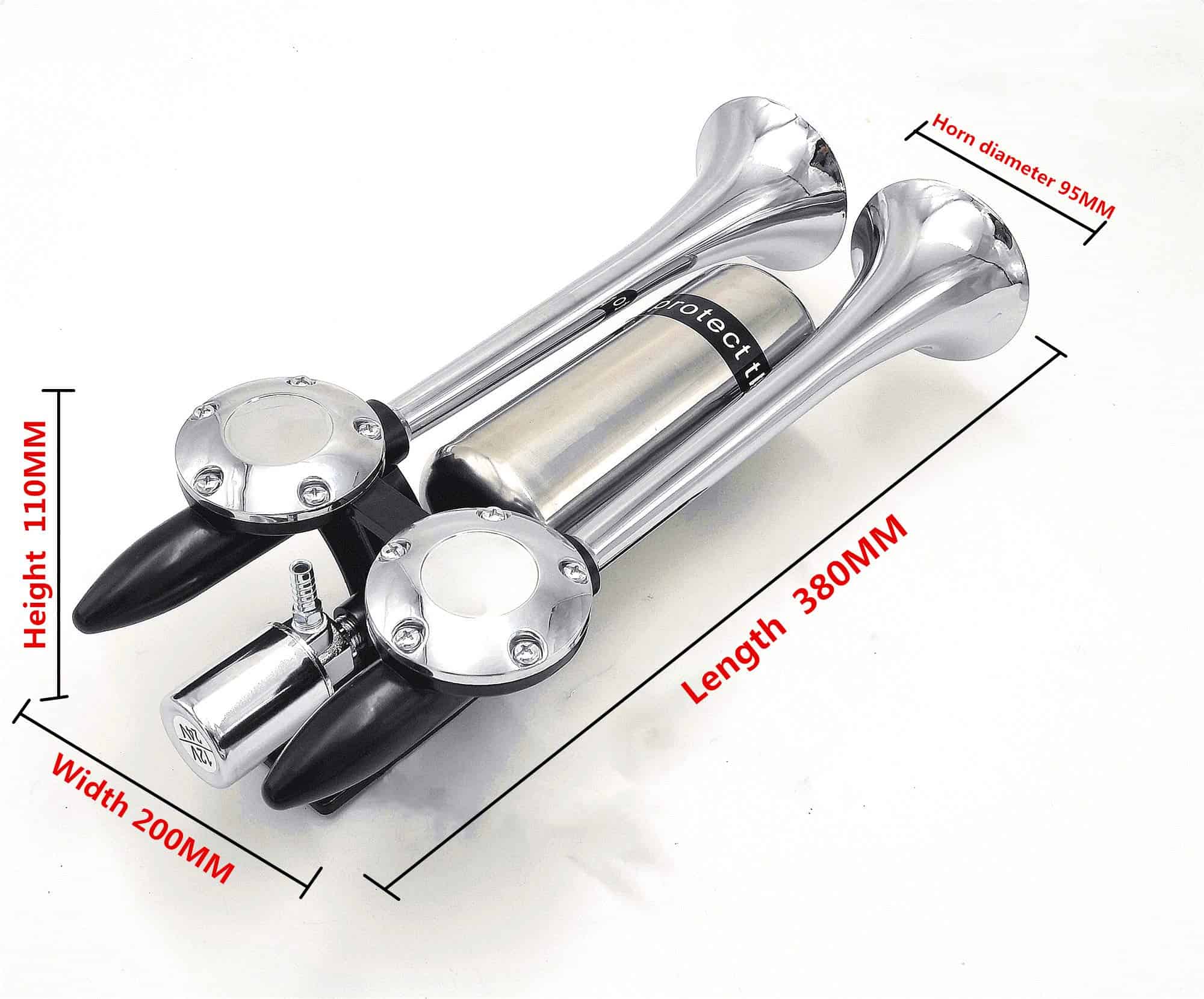 Altavoces nuevos a estrenar. La Bocina de Aire es adecuada para bocinas de aire marinas, con tanques de gas de acero inoxidable, y la bocina es adecuada para cualquier camión, barco, automóvil, motocicleta, camión, etc., de 12v/24v. Dos sintonizadores. Máximo 180db, súper fuerte. Incluye hardware de instalación. Fácil de instalar. Requiere sistema de aire. Especificación: Material: bocina de ZINC cromado de alta calidad (sin óxido) Voltaje: 12V 24V Luminosidad: 180db Longitud: Bocinas largas: dos 28 cm Peso del producto (kg): 1.98kg Peso del paquete (kg): 2.1kg Asegúrate de que las bocinas estén ligeramente inclinadas hacia abajo para que no se acumule agua en ellas. El decibelio máximo del producto es de 180db. Si deseas otra bocina de aire de metal, por favor busca en nuestra tienda en nuestra tienda.