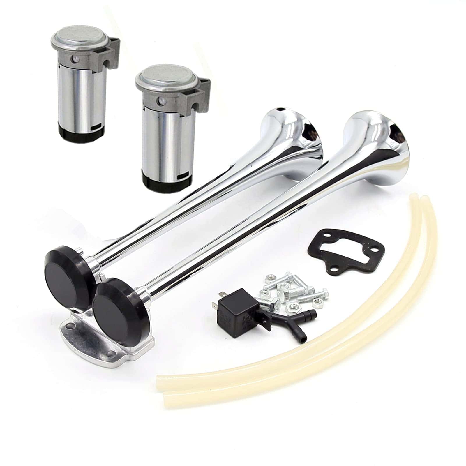 Aplicable a camiones, furgonetas, motocicletas y barcos de 12V, ect. Fácil de instalar. No se requiere sistema de aire. Material: claxon de doble tubo de cromo de zinc de alta calidad (antioxidante) Color: plata Voltaje: 12V Sonido: 165DB Peso (kg): 2.08 kg Incluido en el paquete: 1 x claxon de aire, 2 x compresor, 2 x manguera de aire, 1 juego de hardware de instalación, 1 relé, 1 x zócalo de relé con cableado, 1 x fusible, 1 x fusible incorporado. 1. Debido a la influencia de la fotografía y la luz, el color real puede ser ligeramente diferente de la imagen; Debido a la medición manual, por favor permita una desviación de 1-3 cm. 2. Durante la instalación, asegúrese de que el claxon esté ligeramente inclinado hacia abajo para evitar que entre agua o suciedad en el claxon, afecte el efecto de sonido. 3. El claxon de coche no requiere una fuente de aire adicional. Si necesita otros claxons de coche, por favor busque en nuestra tienda en nuestro tienda.