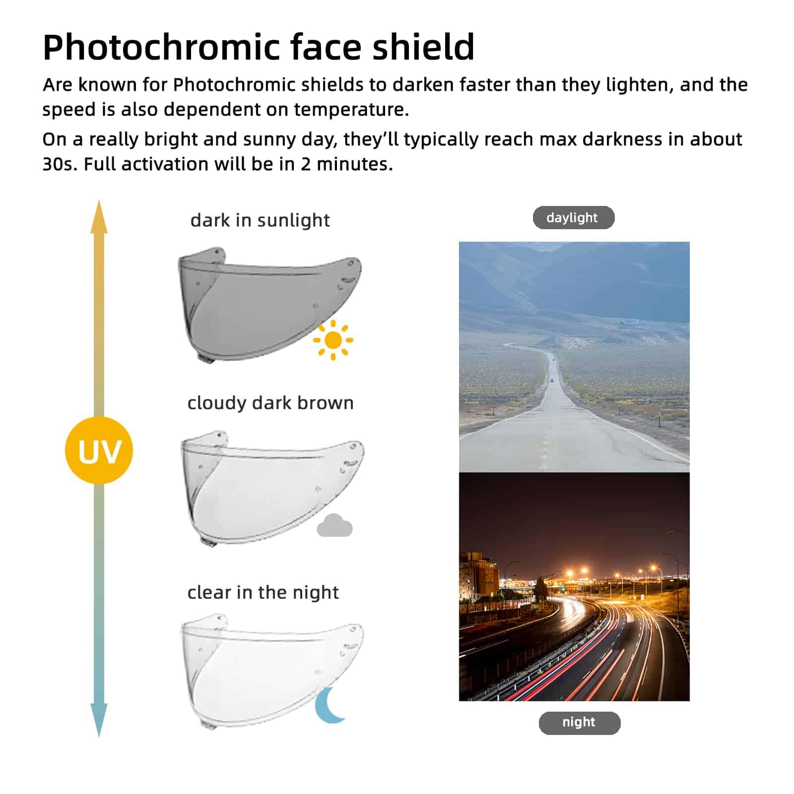 1. Visera foto cromática RF-1400 – La visera foto cromática permite que las viseras cambien automáticamente y de manera uniforme de claro a oscuro bajo la luz del sol. Solo necesita 1 lente para el desplazamiento diario y viajes largos.