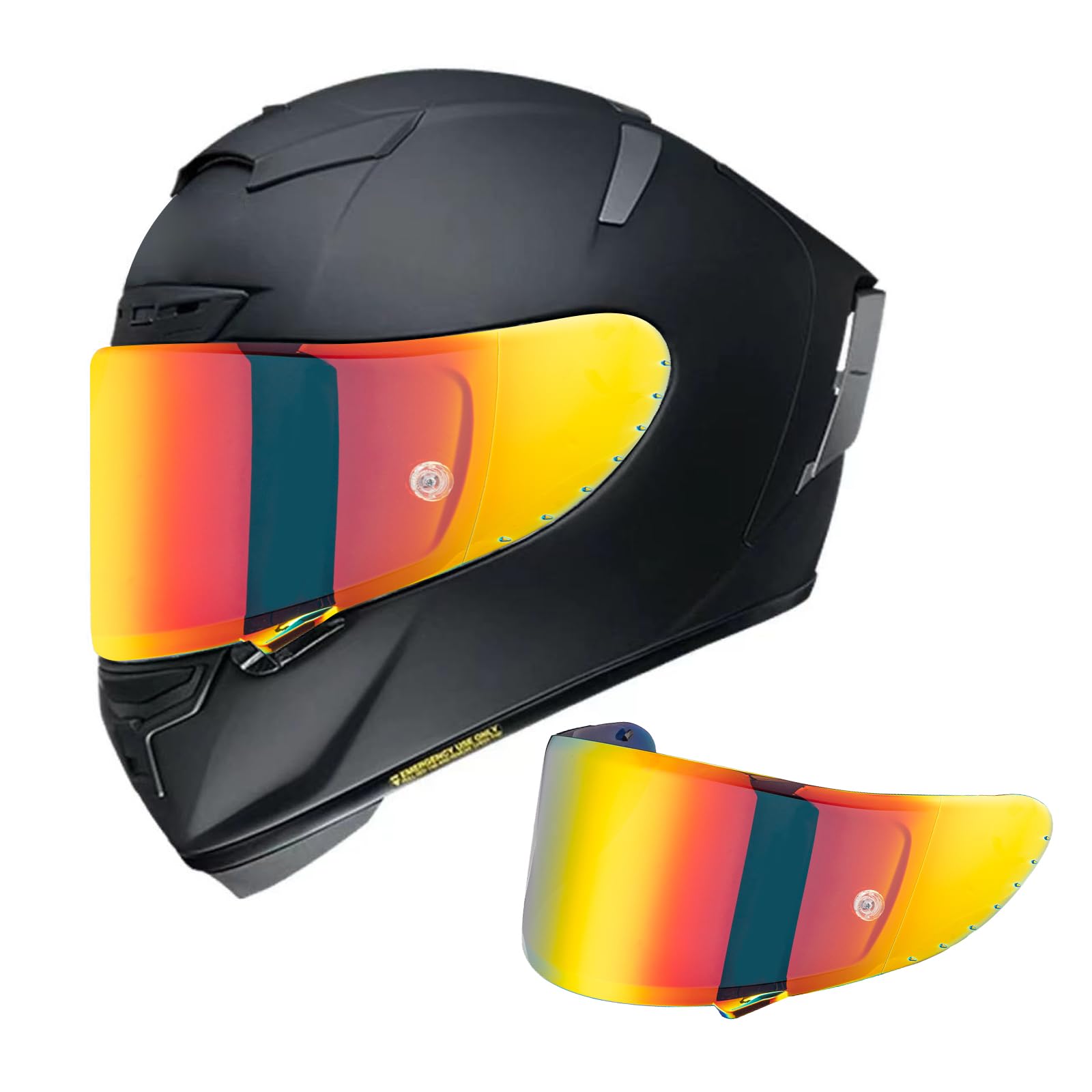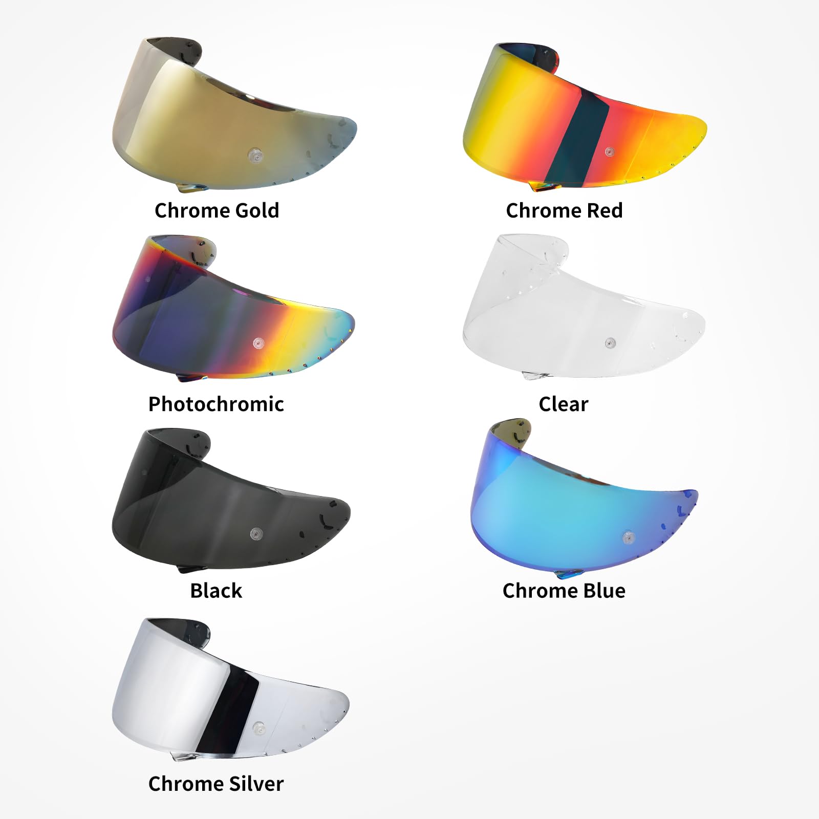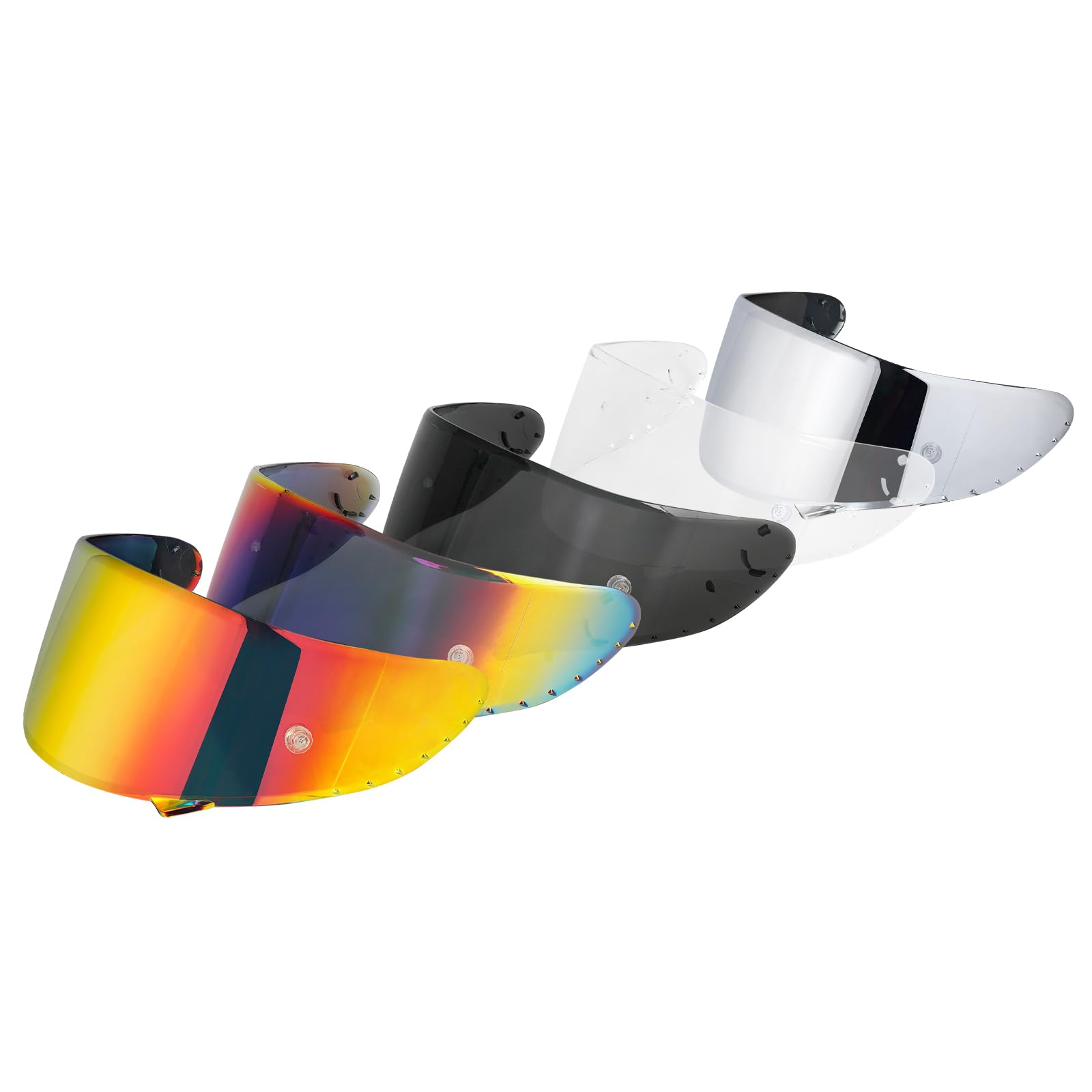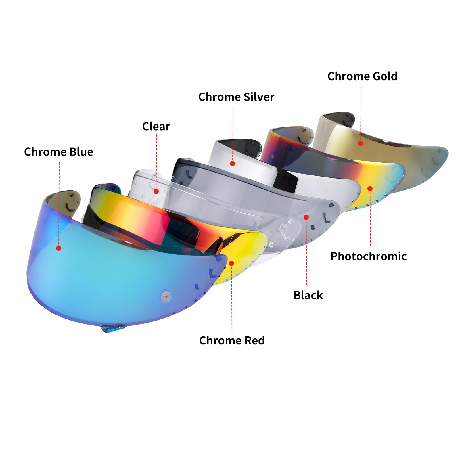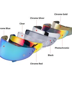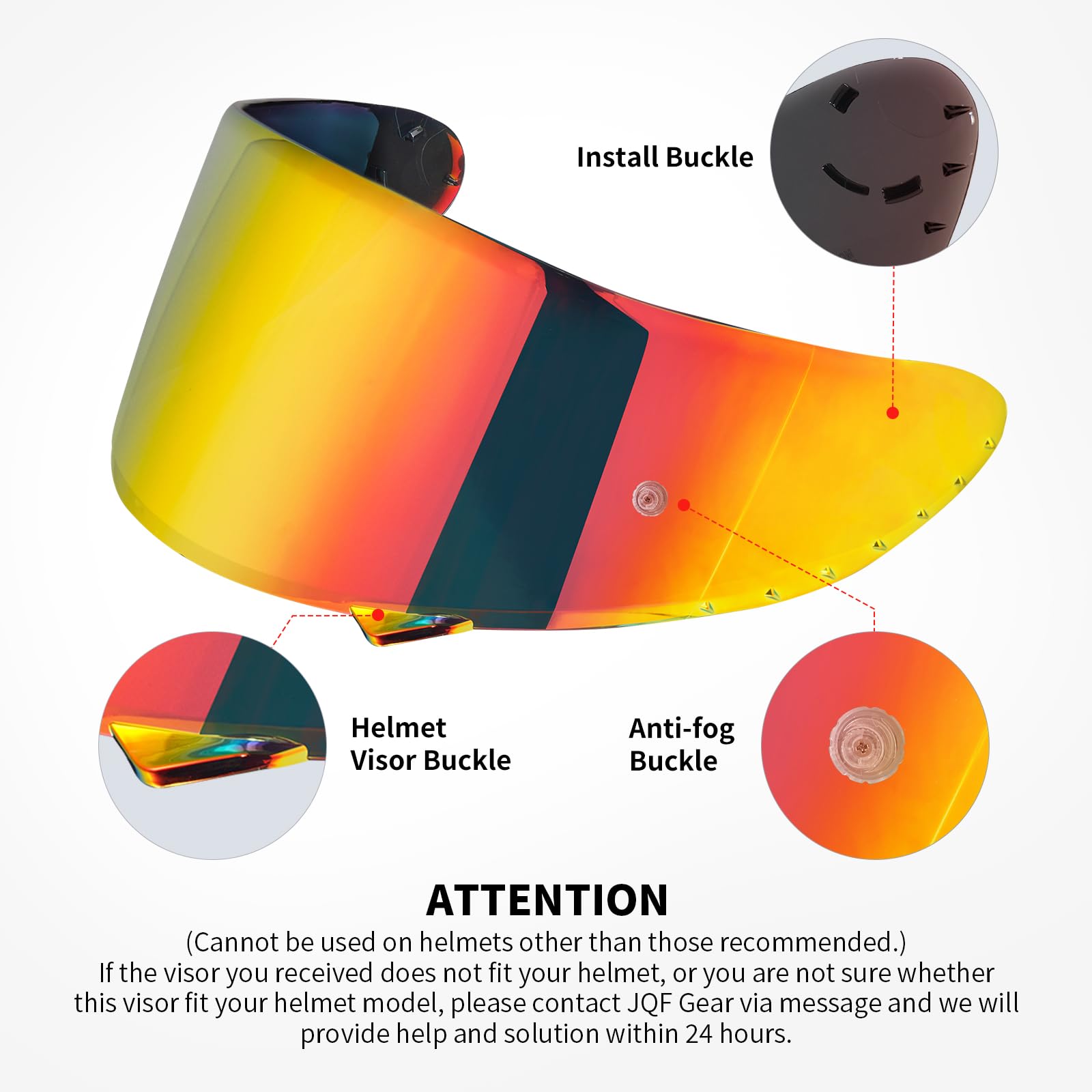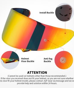 Visera de casco de motocicleta de alta calidad de la marca JQF Gear, diseñada para los modelos X-Fourteen X-Spirit III, RF-1200 y RF-SR. Incluye pins de película antivaho para reemplazo, compatible con pinlock EVO CWR-1 CWR-F. Disponible en 7 colores diferentes: Oro Cromado, Azul Cromado, Negro, Transparente, Rojo-reflectante, Azul-reflectante y Rojo Oscuro. La visera se adapta perfectamente al marco del casco, garantizando una protección eficaz contra el viento, el polvo, los rayones y los rayos UV. Fácil de instalar y quitar, siendo un excelente reemplazo para la visera original del casco.