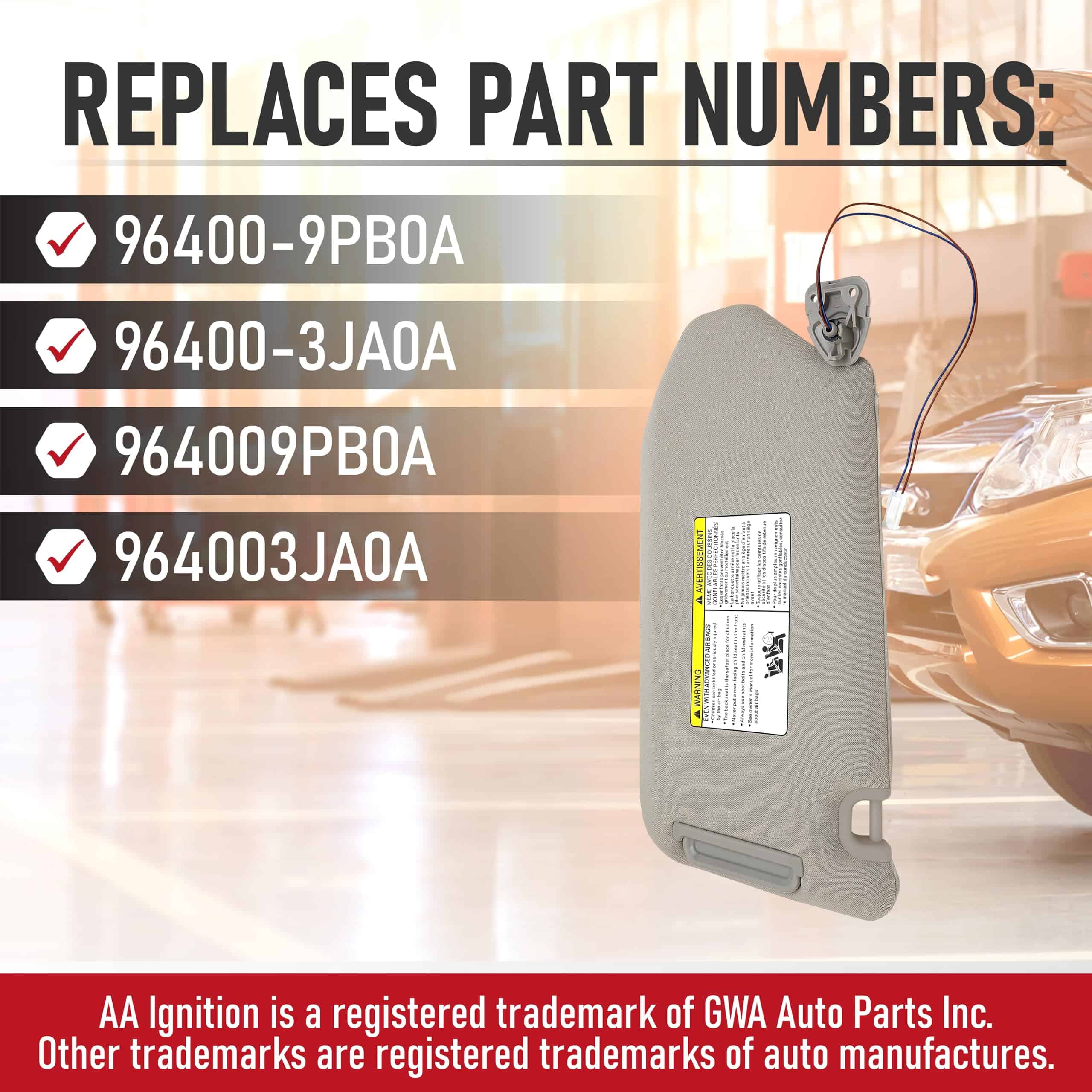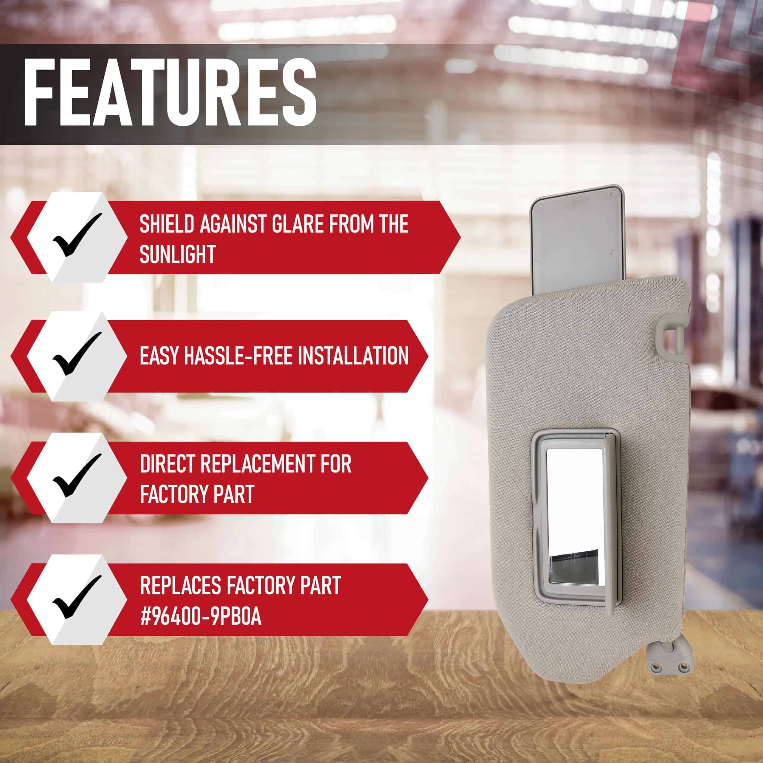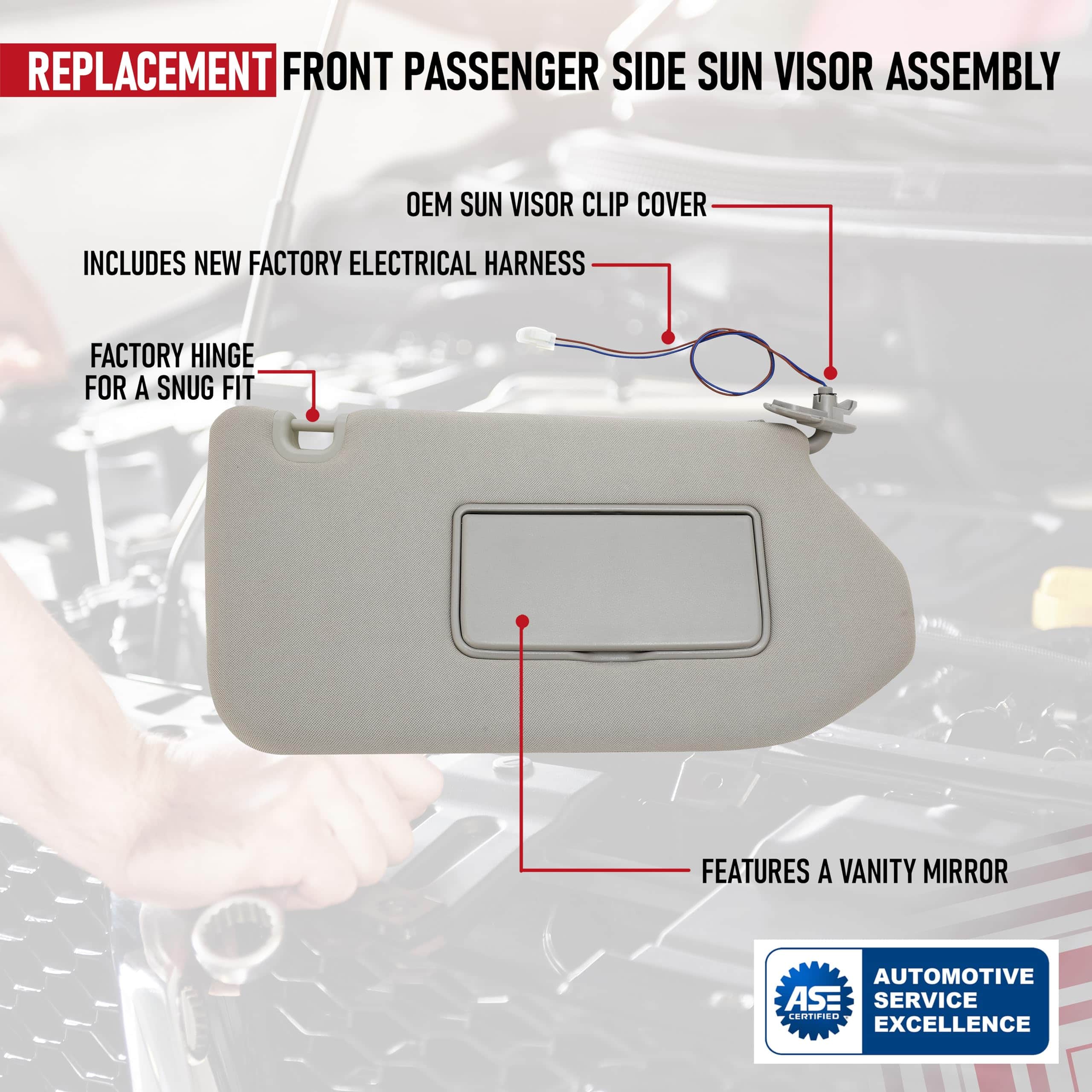2. Compatible con reemplazo para vehículos Nissan e Infiniti – 2013 JX35 Base | 2013, 2014, 2015, 2016, 2017, 2018 QX60 Base | 2019 QX60 Luxe, Pure | 2013 – 2019 Pathfinder Platinum, S, SL, SV | 2013 – 2015 Incluyendo modelos híbridos. Esta visera gris es para el lado del pasajero o derecho y se puede localizar fácilmente dentro del vehículo justo encima del parabrisas delantero y se puede reemplazar utilizando solo herramientas básicas.
