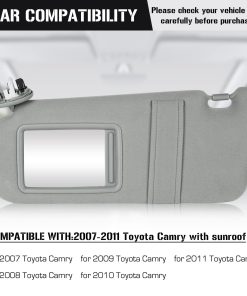 Visera del Sol Izquierda y Derecha con Luz para Toyota Camry 2007-2011 con Techo Corredizo, Lado del Conductor y del Pasajero Color Gris Reemplaza 74320-06800-B0 74310-06800-B0. Esta visera del sol es compatible con Toyota Camry de los años 2007, 2008, 2009, 2010 y 2011. Es solo apta para modelos con techo corredizo y Luz de Vanidad. Fabricada con materiales de alta calidad, esta visera del sol brinda una resistencia y durabilidad superiores. Previene eficazmente la influencia de la luz solar y tiene un gran efecto de enfriamiento, lo que la hace perfecta para protegerse del sol mientras conduce. Reemplaza para los números de parte 74320-06800-B0 y 74310-06770-B0, siendo un reemplazo directo. La instalación es fácil y sin problemas, la visera del sol se puede instalar rápidamente y ajustar perfectamente en su automóvil. Esta visera del sol viene en color gris y tiene una luz integrada. Además, cuenta con una garantía de 12 meses para que pueda comprar con total confianza. Asegúrese de revisar la lista de compatibilidad completa del producto para garantizar que sea adecuado para su modelo de automóvil.