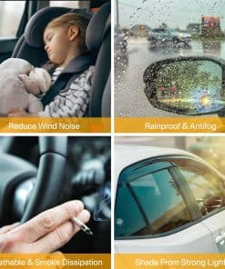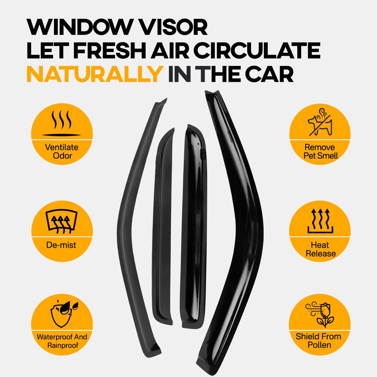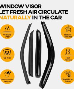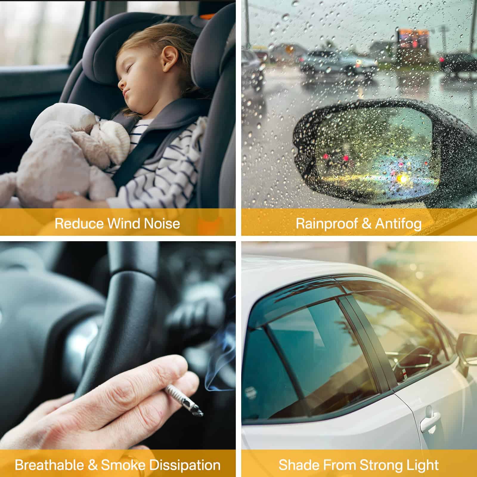2. Renueva Tu Viaje: Los deflectores de guardabarros de ventanas te protegen a ti y al interior de tu vehículo de tiempo húmedo. Desvía la lluvia, así como la nieve, el granizo y la nieve aguanieve de entrar en las ventanas de tu vehículo. Los visores de ventanas también ayudan a mejorar la ventilación dentro de tu vehículo para una conducción más segura, reducir el empañamiento de ventanas y espejos, y aumentar el flujo de aire.