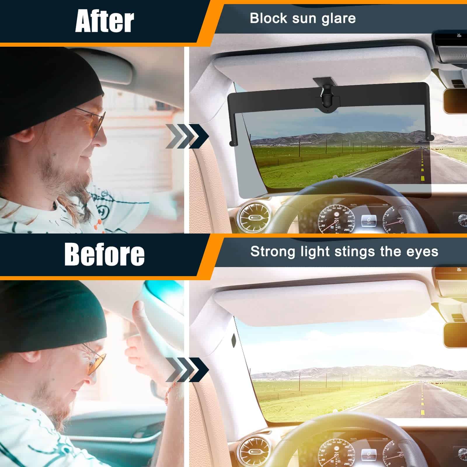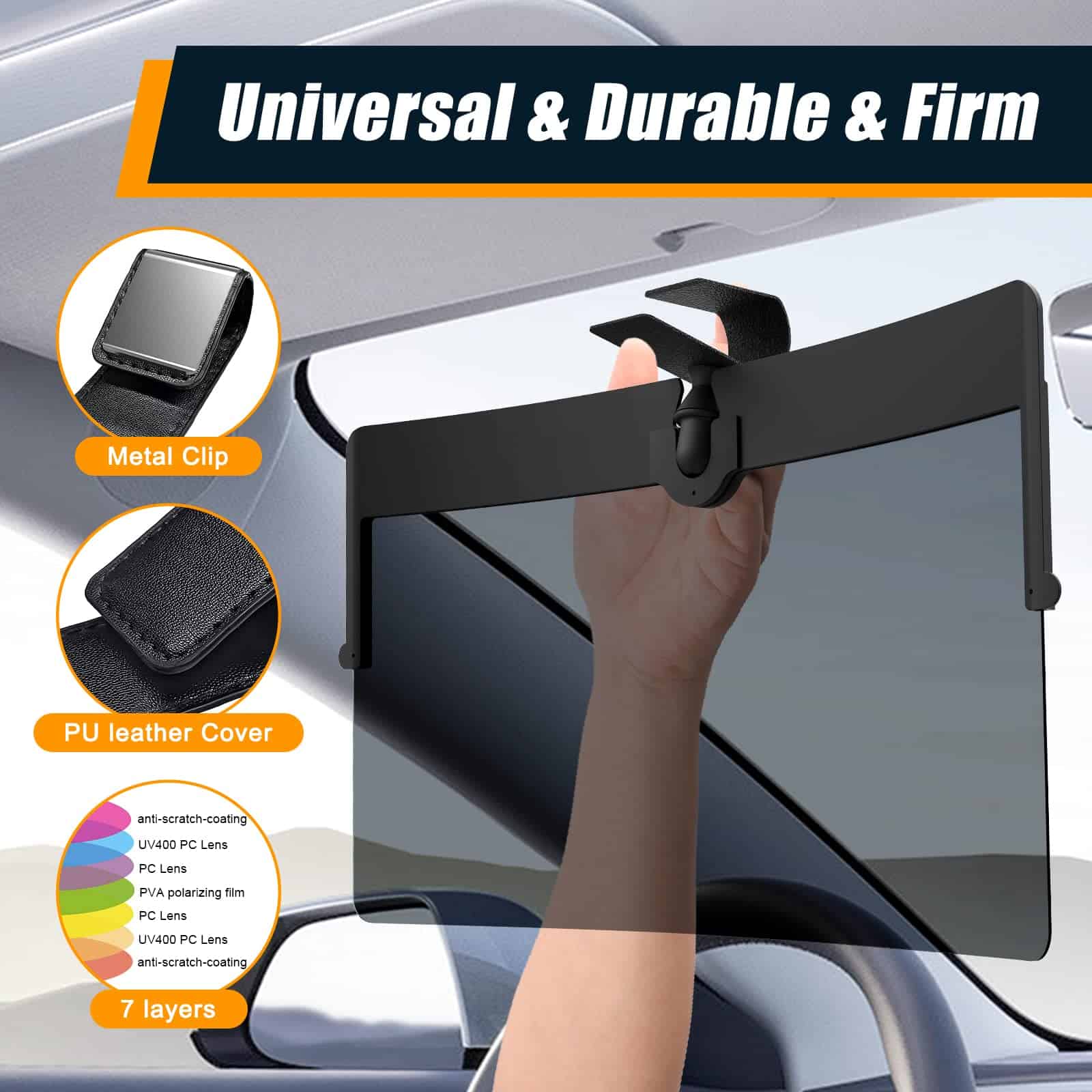 1. Visera Polarizada Anti-Glare para Coche: Esta visera cuenta con una lente polarizada que ayuda a bloquear el deslumbramiento del sol y las luces reflejadas deslumbrantes de edificios o la parte trasera de los coches. Esto hace que sea más fácil para los conductores ver con claridad y conducir de forma segura. Además, la visera solar también protege contra los dañinos rayos UV del sol, reduce la fatiga visual y mejora la experiencia de conducción en general.