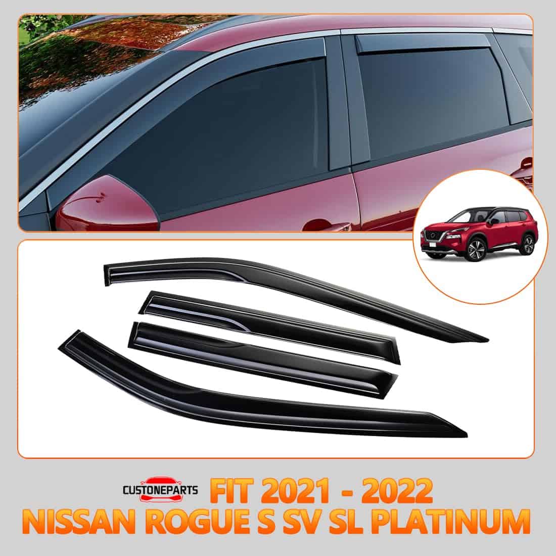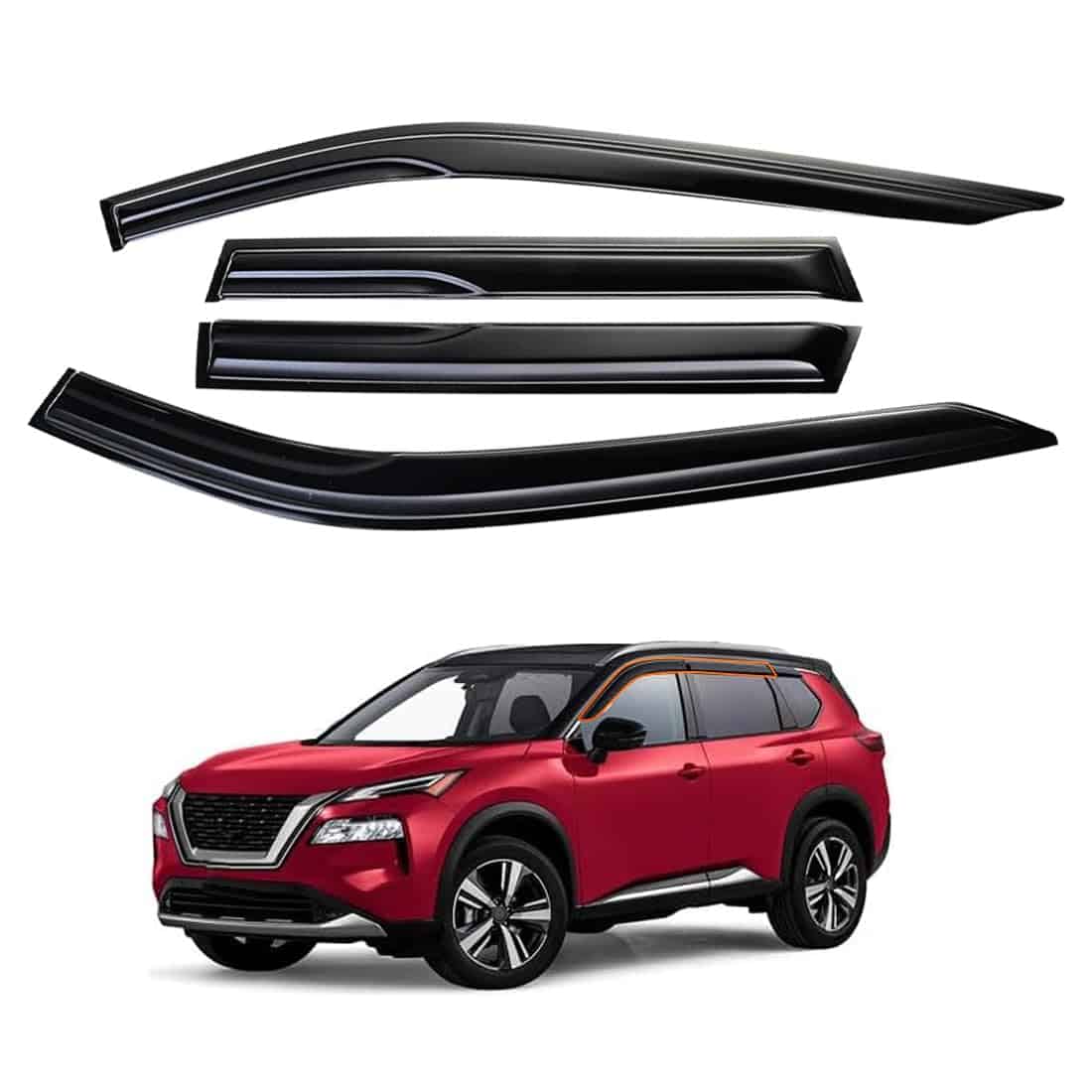 Viseras de Ventana Lateral con Cinta Deflectores de Lluvia Compatible con Nissan Rogue S SV SL Platinum 2021�2022 � 4 Piezas Viseras de Ventana de Acrílico Ahumado Fácil Instalación. Esta conjunto de viseras de ventana lateral está diseñado para adaptarse a varios modelos de Nissan Rogue, incluyendo S, SV, SL y Platinum para los años 2021 y 2022. Estas viseras están fabricadas con acrílico ahumado de alta resistencia que es resistente a los rayos UV y a la intemperie, lo que garantiza su durabilidad a lo largo del tiempo. El paquete incluye 2 viseras delanteras y 2 traseras, con cinta adhesiva de grado automotriz preaplicada para una instalación sencilla y rápida. Además de brindar protección contra la lluvia y permitir la ventilación, estas viseras ayudan a minimizar el ruido del viento y la acumulación de calor en la cabina, mejorando así la comodidad de conducción en diversas condiciones climáticas. El diseño sin herramientas con cinta adhesiva facilita su colocación en los contornos del marco de la ventana sin necesidad de perforaciones.