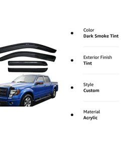 Las viseras de ventana y desviadores de aire son compatibles con: Ford F150 SuperCrew/Cabina Doble 2009 2010 2011 2013 2014. Nota: La cabina super crew tiene cuatro puertas de tamaño completo que se abren en la misma dirección. Posición: 2 piezas para las puertas delanteras y 2 piezas para las puertas traseras. Incluido en el paquete: 4 visores de ventana de sombra (La instrucción de instalación no está incluida, consulte la imagen de instalación de muestra arriba para referencia). Estilo: Estilo de cinta (Se pega en la puerta y por encima de las ventanas. No es el estilo en canal)