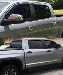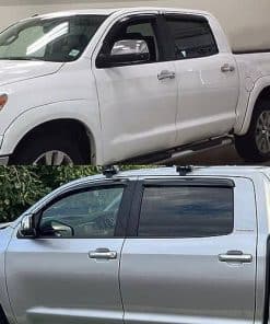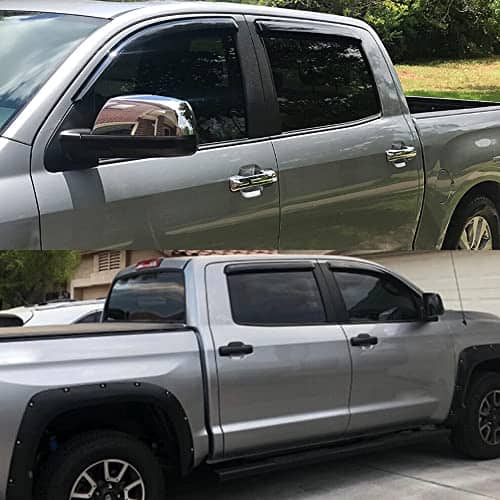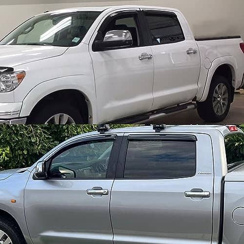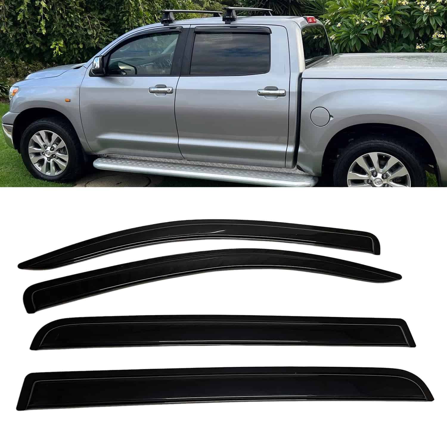 1. Compatibilidad: Compatible con Toyota Tundra Crewmax Cab (solo cabina de tripulación) 2007-2021. 2. Material duradero: Hecho de material acrílico modificado de alta calidad, el juego de protectores contra la lluvia no se agrietará, romperá ni astillará. 3. Diseño efectivo: Más cómodo al conducir, sin preocuparse por el ruido del viento, la nieve helada, las molestas salpicaduras de lluvia, el sol abrasador. 4. Montaje fácil con cinta adhesiva: simplemente pele y pegue estos visores de ventanas para la lluvia. Le permite adherir estos visores de ventanas para automóviles en solo minutos sin necesidad de herramientas o instrucciones complicadas. La cinta súper fuerte proporciona un agarre seguro que no se soltará. El montaje externo es resistente al agua y duradero en todas las condiciones climáticas. 5. Consejos de instalación: Use la pistola de calor o secador de pelo para calentar el borde de montaje después de colocar los visores. Esto es muy recomendable y útil para pegar los visores firmemente, especialmente en días fríos.