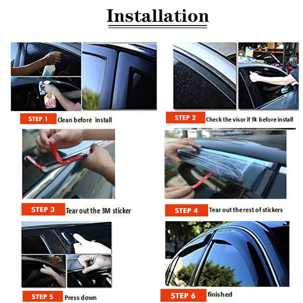 Ajuste 2006-2012 Toyota RAV4 (XA30) Artículo Ofrecido 4pcs visera de ventana con sombra (Instrucciones de instalación no incluidas, por favor revise la imagen de instalación de muestra anterior para referencia) Estilo Estilo de montaje exterior, fácil instalación con Peel-N-Stick. No se requiere cortar ni taladrar (pegar en la puerta y encima de las ventanas. No es estilo de canal) Posición 4pcs para viseras delanteras y traseras (conductor y pasajero) Material Acrílico reforzado Color Tinte de humo oscuro Instalación Diseño de cinta directa, fácil instalación con Peel-N-Stick. No se requiere cortar ni taladrar Condición-Función del artículo 100% Nuevo en caja. Protegido completamente de las ventanas de los rayos del sol, viento, lluvia, deflector de nieve. Ayuda a reducir la acumulación de calor en los vehículos estacionados permitiendo el paso de aire cuando está parcialmente abierto. Material duradero diseñado para resistir las inclemencias del tiempo. Permite dejar las ventanas bajadas unas pulgadas para obtener aire fresco incluso en días lluviosos. Viene con cintas de doble cara de grado automotriz 3M. Instalación fácil. Mejora drásticamente el estilo y la apariencia.