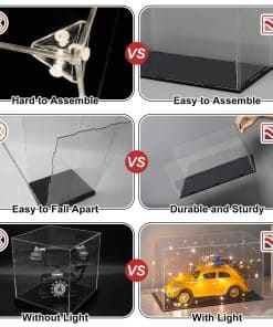 Material: Material plástico acrílico transparente Color: Transparente Tamaño: (1) Caja de Exhibición: 15x10x10cm; 6x4x4 pulgadas (2) Caja de Exhibición: 18x12x12cm; 7×4.7×4.7 pulgadas (3) Caja de Exhibición: 25x15x20cm; 10x6x8 pulgadas (4) Caja de Exhibición: 30x10x10cm; 12x4x4 pulgadas (5) Caja de Exhibición: 30x25x25cm; 12x10x10 pulgadas (6) Caja de Exhibición: 30.5x20x20cm; 12x8x8 pulgadas (7) Caja de Exhibición: 37x28x31cm; 14.6x11x12 pulgadas (7) Caja de Exhibición: 42x21x27cm; 15.7×8.3×10.6 pulgadas Paquete incluido 1 Vitrina de Acrílico 1 Guante 1 Paño de limpieza 1 Placa redonda transparente (Desgarrando la película protectora en la superficie de acrílico) Instrucciones Para proteger la claridad y transparencia de la vitrina de acrílico, usamos una pegatina para proteger ambos lados de la hoja acrílica. Asegúrate de ensamblarlo después de quitar la doble capa de pegatina protectora. Utiliza una placa transparente para desgarrar la película protectora de doble capa en la superficie de acrílico. Proporcionamos guantes desechables y paño limpio para evitar manchas de huellas dactilares y polvo. Ensambla la vitrina de acrílico con guantes y límpiala con un paño limpio después del montaje. Una vitrina transparente y limpia se muestra frente a ti. Puedes ver mejor tus artículos colocando esta vitrina en tu escritorio, estante o armario. El acrílico transparente resalta la belleza de tus artículos y atrae su atención. Inspira la imaginación y creatividad de tu hijo para mostrar/su colección favorita. Mantén la colección libre de polvo, reduce la luz solar y la radiación ultravioleta, y retrasa el envejecimiento del plástico. La caja muestra hardware, arte, relojes, coleccionables, tarjetas de béisbol, artefactos, flechas, cajas de cerillas y objetos de recuerdo deportivos. Aparece en tiendas minoristas, joyerías, ferias de arte y artesanía, ferias comerciales, mercados de pulgas e intercambios. Protege y muestra tus colecciones favoritas como figuras, modelos, y más.