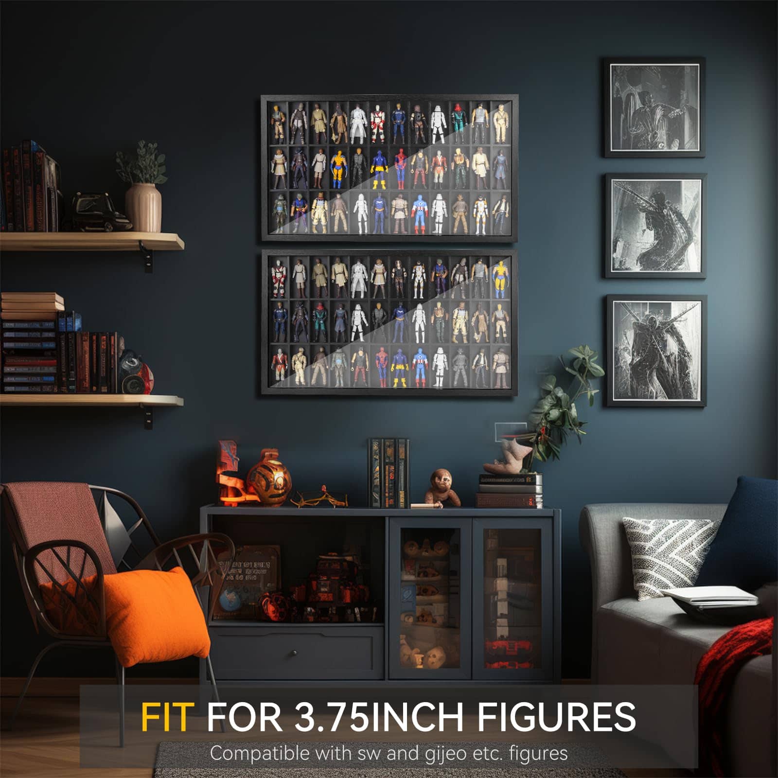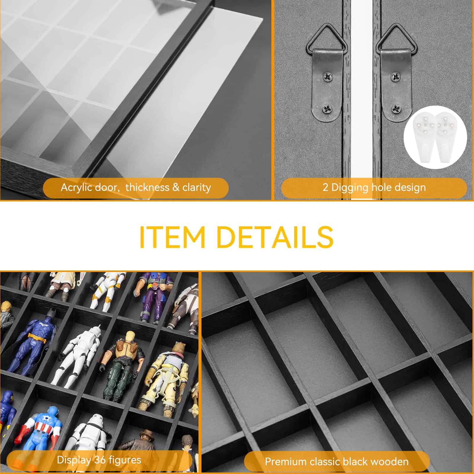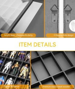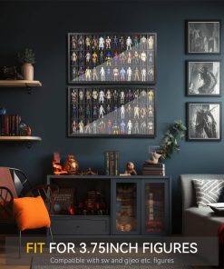 Vitrina de Exhibición para Figuras de 3.75 Pulgadas, Estuche para Coleccionistas de Figuras, Gabinete a Prueba de Polvo para Coleccionables, Compatible con Series de Star Wars/ G.I. Joe, 24.61″ X 1.65″ X 13.98″. Adecuado para figuras Modernas y Vintage de Star Wars/ G.I. Joe, etc. de 3.75 pulgadas de altura (NO APTO PARA FIGURAS DE MÁS DE 3.75 PULGADAS). Diseño de tamaño grande, capaz de contener hasta 36 figuras. La puerta del estuche está firmemente sujeta por el espesor y la claridad del acrílico, que es resistente y no se rompe fácilmente, y el acrílico en sí mismo parece claro como el cristal cuando se muestra. El acrílico lo mantiene libre de polvo, asegurando que tus colecciones mantengan colores vibrantes. Las vitrinas de exhibición de figuras de FIGURESLAB están hechas de madera clásica negra de primera calidad, libre de arañazos, bien moldeada, bordes lisos, resistente y duradera. El paquete incluye algunos accesorios y está diseñado con 2 orificios en la parte trasera de cada estuche de figura para un uso conveniente. El estuche de exhibición de figuras de FIGURESLAB viene completamente ensamblado, puedes colgarlo en la pared o colocarlo directamente en el escritorio. Cada caja de sombra con estantes no tiene compartimentos fijos, por lo que puedes colocar las colecciones según tu propia idea. Por favor, quita el film protector antes de usar.