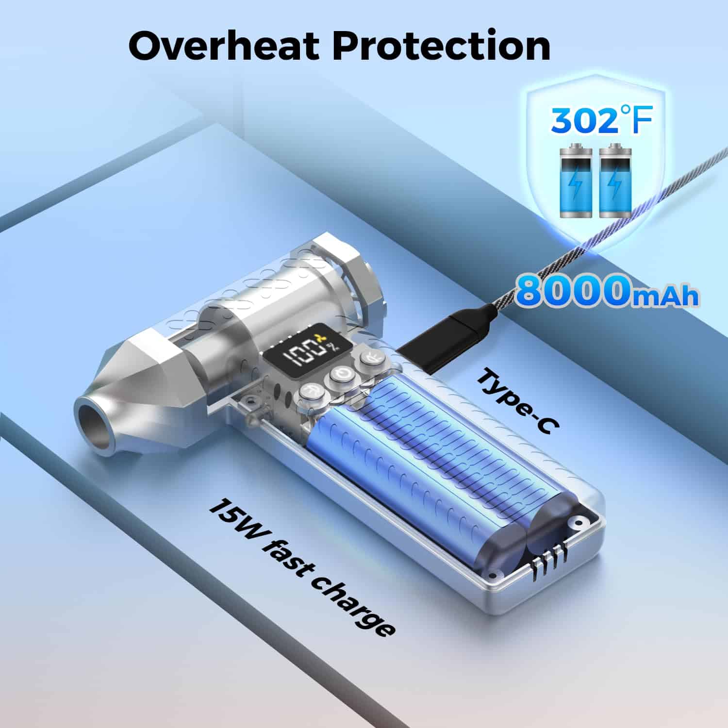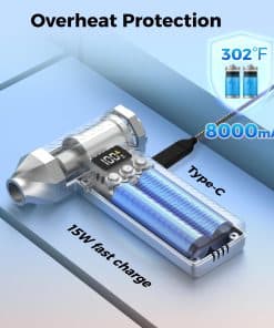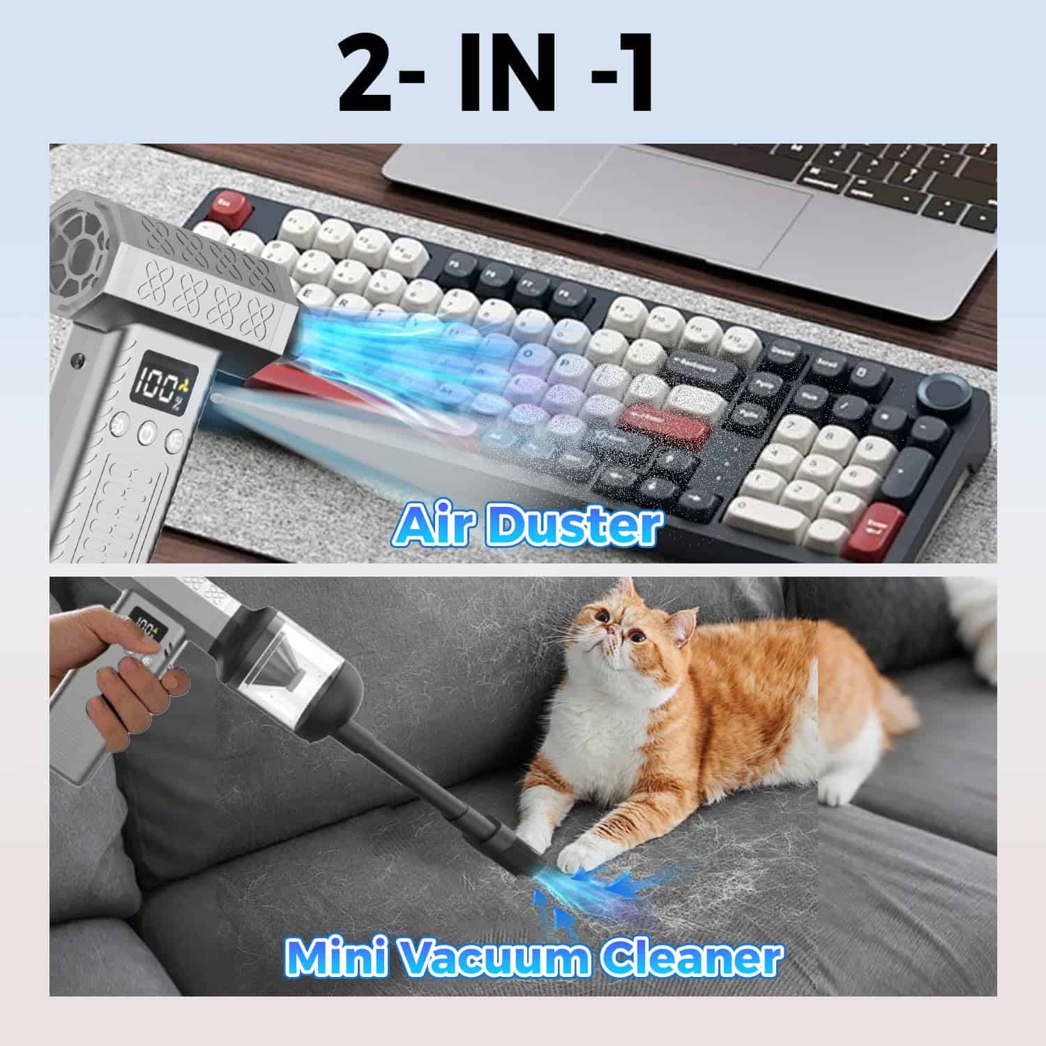 2 en 1 Duster de Aire y Miniaspiradora. ¡No solo es un duster de aire comprimido, sino también una miniaspiradora inalámbrica, tan fácil de limpiar el polvo y los desechos. Perfecto para limpiar el polvo de cualquier dispositivo electrónico, teclados de computadora y otras superficies en tu coche, oficina o hogar. Múltiples Usos–Nuestro mini duster de aire eléctrico es ligero con 263g. Fácil de llevar, lo podemos usar en interiores y exteriores. Adecuado para una variedad de escenarios, como limpiar escritorios, teclados, lentes de cámaras, computadoras portátiles, asientos de automóviles y persianas, etc. También lo usamos para inflar, como camas inflables, botes salvavidas, etc. Y lo podemos usar para picnics y fogatas, limpiar pisos, expulsar el aire de la bolsa de aspiradora, limpiar el pelo de mascotas y soplar gotas de agua en ventanas. Nuestro Aspirador de Coche Inalámbrico viene con luz LED, podemos ver claramente cuando lo usamos en la oscuridad. Carga Tipo-C Recargable y Compacto y Ligero. Batería incorporada de alta capacidad de 8000mAh, puede usarse continuamente durante aproximadamente 4 horas (viento suave). Carga rápida Tipo-C, completamente cargada en 2.5 horas. Puedes cargarla en casa, oficina o en el coche. Compacto y ligero, fácil de llevar. Se puede almacenar en tu bolso o en el tablero del coche. Un artículo imprescindible para barbacoas y otras actividades al aire libre, eventos y más.