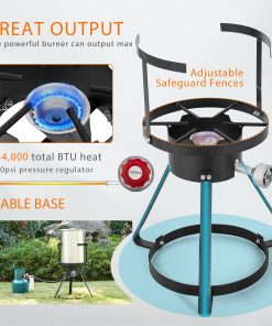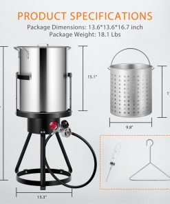 Esta freidora de pavo VIVOHOME es perfecta para una amplia variedad de aplicaciones, desde freír pavo y pescado hasta cocinar mariscos, sopa, maíz, papas y mucho más. Hecha de aluminio duradero, la freidora y la cesta garantizan una óptima conducción de calor y son fáciles de limpiar y mantener. El potente quemador de 54,000 BTU puede mantener una temperatura constante y cocinar rápidamente una variedad de alimentos. La freidora cuenta con asas para facilitar su transporte y uso, y la cesta de vaporera con handle permite una fácil colocación y extracción de alimentos. El termómetro de sonda de 12 pulgadas garantiza una temperatura precisa de cocción, mientras que el inyector puede mejorar el sabor del pavo inyectando salsa preparada en la carne. Con este kit de freidora de pavo, cada comida será deliciosa y jugosa. ¡Haz de tu próxima cena al aire libre una experiencia inolvidable con la freidora de pavo VIVOHOME!
