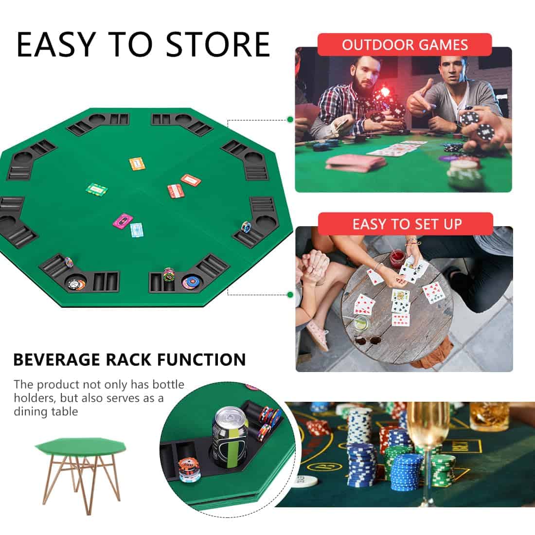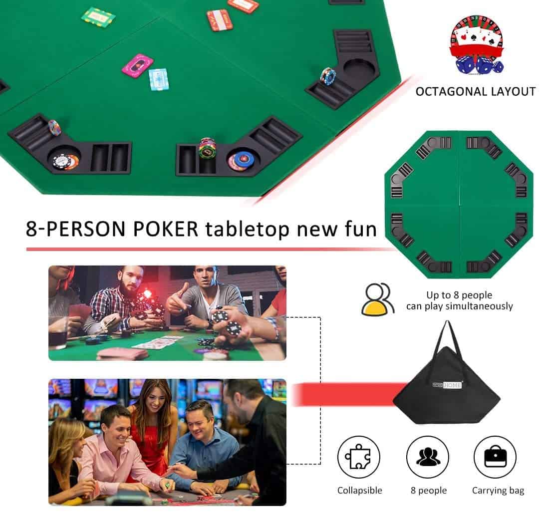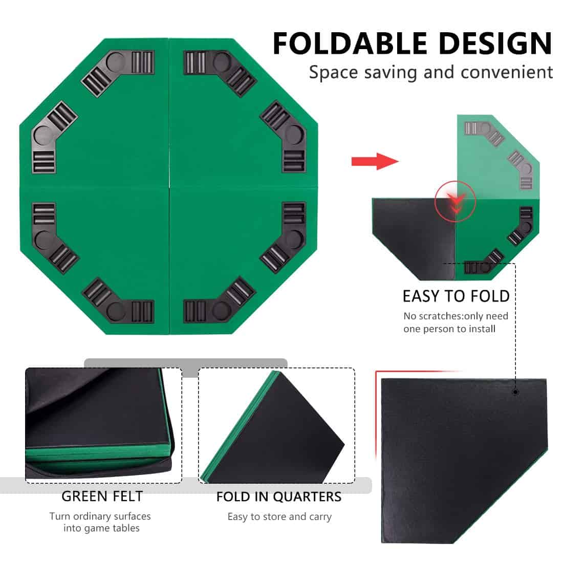 DURADERO Y CONFIABLE MATERIAL – El cuerpo principal de la parte superior de la mesa está hecho de MDF; A diferencia de la madera sólida, es a prueba de óxido y puede resistir la humedad y altas temperaturas; Con alta dureza, no se dañará después de un uso prolongado; El revestimiento suave tradicional reduce la fricción y lo hace cómodo de jugar; Utilizamos PU de alta calidad en la parte inferior para un recubrimiento transpirable, flexible y duradero. ASPECTO PROFESIONAL – La estructura de la mesa con diseño octogonal puede acomodar perfectamente a 8 jugadores; El paño verde puede aliviar el estrés y la fatiga de tus ojos; Los portavasos independientes y las bandejas de fichas de póker integradas te brindan más diversión y ofrecen un lugar conveniente para guardar tus cosas; Juega como si estuvieras en Las Vegas. PORTÁTIL PARA UNA EXPERIENCIA DIVERTIDA – Además de un diseño plegable, también proporcionamos una bolsa de transporte portátil hecha de tela Oxford 600D que te permite viajar de manera ligera y rápida; El bolso negro con logotipo no solo es sencillo en apariencia sino también duradero en uso, manteniendo tu mesa de juego de cartas de póker limpia en su interior. MÚLTIPLES ESCENARIOS – Con nuestro diseño de 4 pliegues inigualable y la bolsa de transporte portátil, nunca tendrás que preocuparte por dónde jugar; Adaptado para Blackjack, Texas hold’em, Bridge, 5 Card Stud y otros juegos de mesa, es adecuado para actividades al aire libre o en interiores, ya sea camping, picnics, despedidas de soltero, fiestas previas a los partidos, reuniones sociales o noches de juegos en familia.