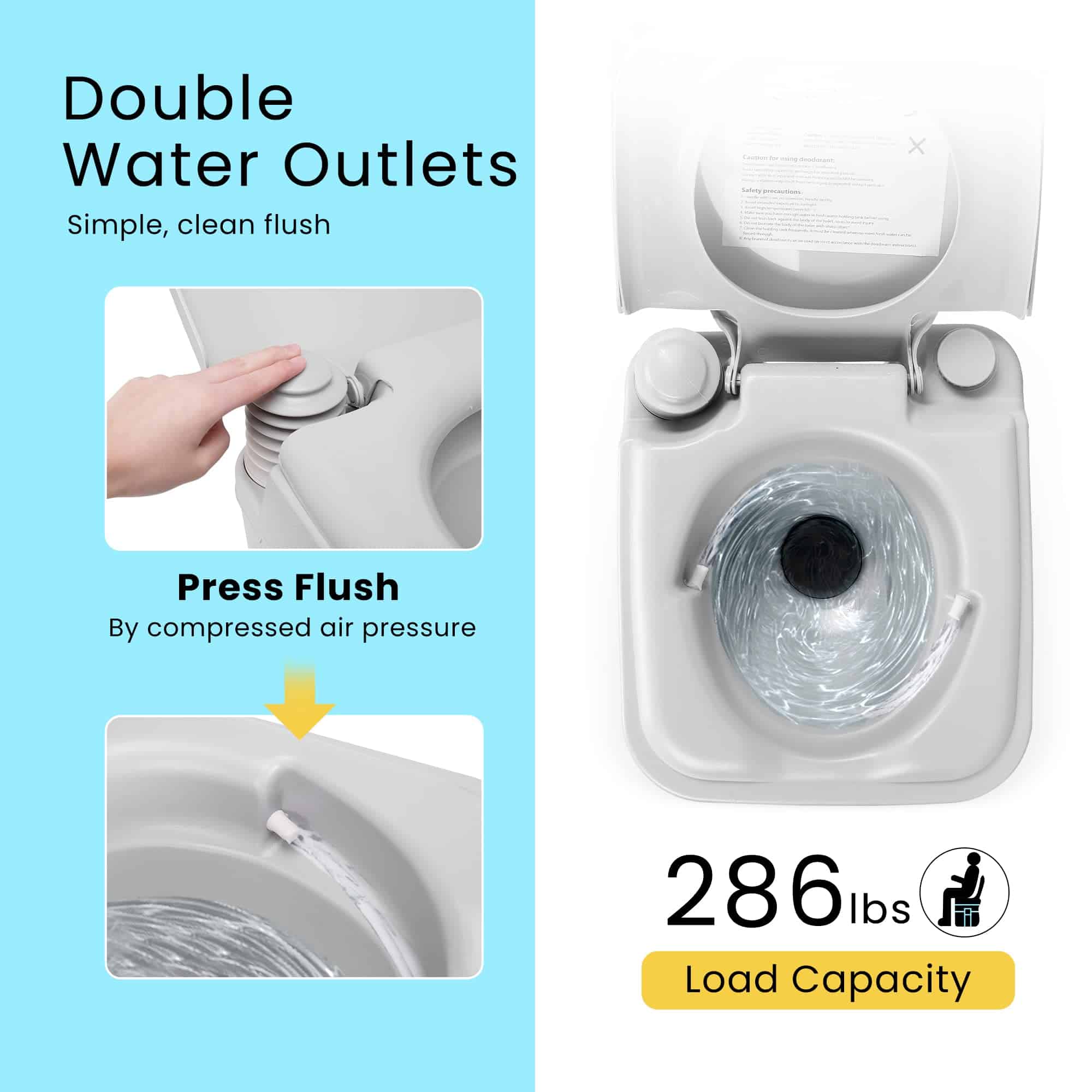 3. DOBLE SALIDA DE AGUA – En comparación con los inodoros portátiles de salida única en el mercado, nuestro diseño mejorado de dobles salidas de agua facilita la limpieza y evita el problema embarazoso de dejar manchas en la esquina muerta con una sola tubería; La gran capacidad del tanque de almacenamiento del inodoro, con capacidad de almacenamiento de 5.3 galones de aguas residuales y capacidad de agua fresca de 2.5 galones, le permiten enjuagar aproximadamente 40 veces.