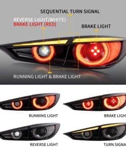 NOTA 1. Preste atención a la información de ajuste de las luces y seleccione las luces apropiadas según su automóvil. 2. Bombillas: NO NECESARIAS (LED completo). Ajuste Las luces traseras YUANZHENG 0317 son compatibles con Mazda 3 s Touring / s Grand Touring / i / i SV / i Grand Touring / S / I Touring / I Sport / GT / GX / GS Sedan de 4 puertas del 2014 al 2018. Somos el Fabricante Zhejiang Yuanzheng Auto & Motorcycle accessories Ltd es el fabricante líder y empresa matriz de la marca VLAND. YUANZHENG está especializado en el diseño y fabricación de accesorios para autos modificados. Nuestros productos son populares en China, Estados Unidos, el sudeste asiático, Rusia, Medio Oriente y muchos otros países. Paquete incluido 1 par de luces traseras (lados del conductor y del pasajero) 1 Manual de usuario Especificaciones Impermeable: IP67 Rigurosamente probado: DOT y SAE Color de carcasa: Negro Color de lente: Ahumado Voltaje de funcionamiento: 12V 35W Material de la carcasa: ABS, PMMA, VIDRIO Material de la lente: PC Barra de luces: LED 6000K Luz incluida: luz de marcha + luz de freno + luz de intermitente + luz de reversa Tipo de bombillas: NO NECESARIAS (LED completo) Estilo: Estilo de fábrica OE, reemplace directamente, no requiere modificación ni perforación. Mantenimiento del fabricante: un año a partir de la fecha de entrega. Nos centramos en Diseño original único Alta calidad Precio competitivo