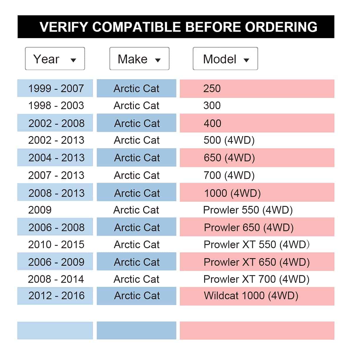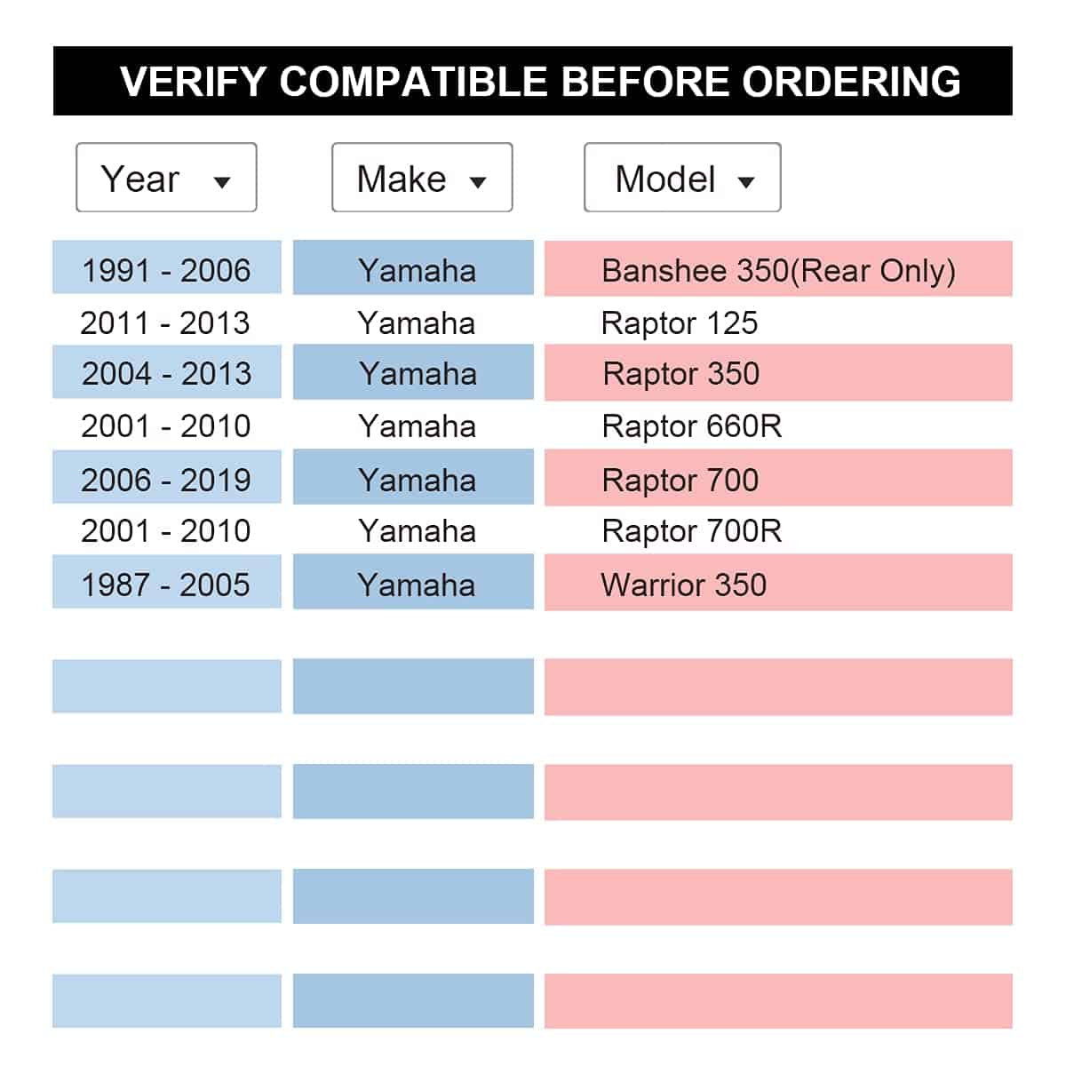 Si no está seguro de si este artículo se ajusta a su vehículo, contáctenos con el año, fabricante y modelo de su vehículo, encontraremos el artículo que necesita. Compatible con Arctic Cat: 1999-2007 250, 1998-2003 300, 2002-2008 400, 2002-2013 500 (4WD), 2004-2013 650 (4WD), 2007-2013 700 (4WD), 2008-2013 1000 (4WD), 2009 Prowler 550 (4WD), 2006-2008 Prowler 650 (4WD), 2010-2015 Prowler XT 550 (4WD), 2006-2009 Prowler XT 650 (4WD), 2008-2014 Prowler XT 700 (4WD), 2012-2016 Wildcat 1000 (4WD). Compatible con Yamaha: 1991-2006 Banshee 350 (solo trasera), 2011-2013 Raptor 125 (solo trasera), 2004-2013 Raptor 350 (solo trasera), 2001-2010 Raptor 660R (solo trasera), 2006-2019 Raptor 700 (solo trasera), 2001-2010 Raptor 700R (solo trasera), 1987-2005 Warrior 350 (solo trasera). Importante: Verifique que el conteo de pernos, el diámetro del círculo de los pernos, el diámetro central y el tamaño de los pernos coincidan con su vehículo antes de realizar el pedido. Recomendamos que este kit sea instalado por un profesional capacitado, aunque no es necesario. No recomendamos instalar las tuercas de los pernos con una herramienta electrónica, es mejor hacerlo manualmente.