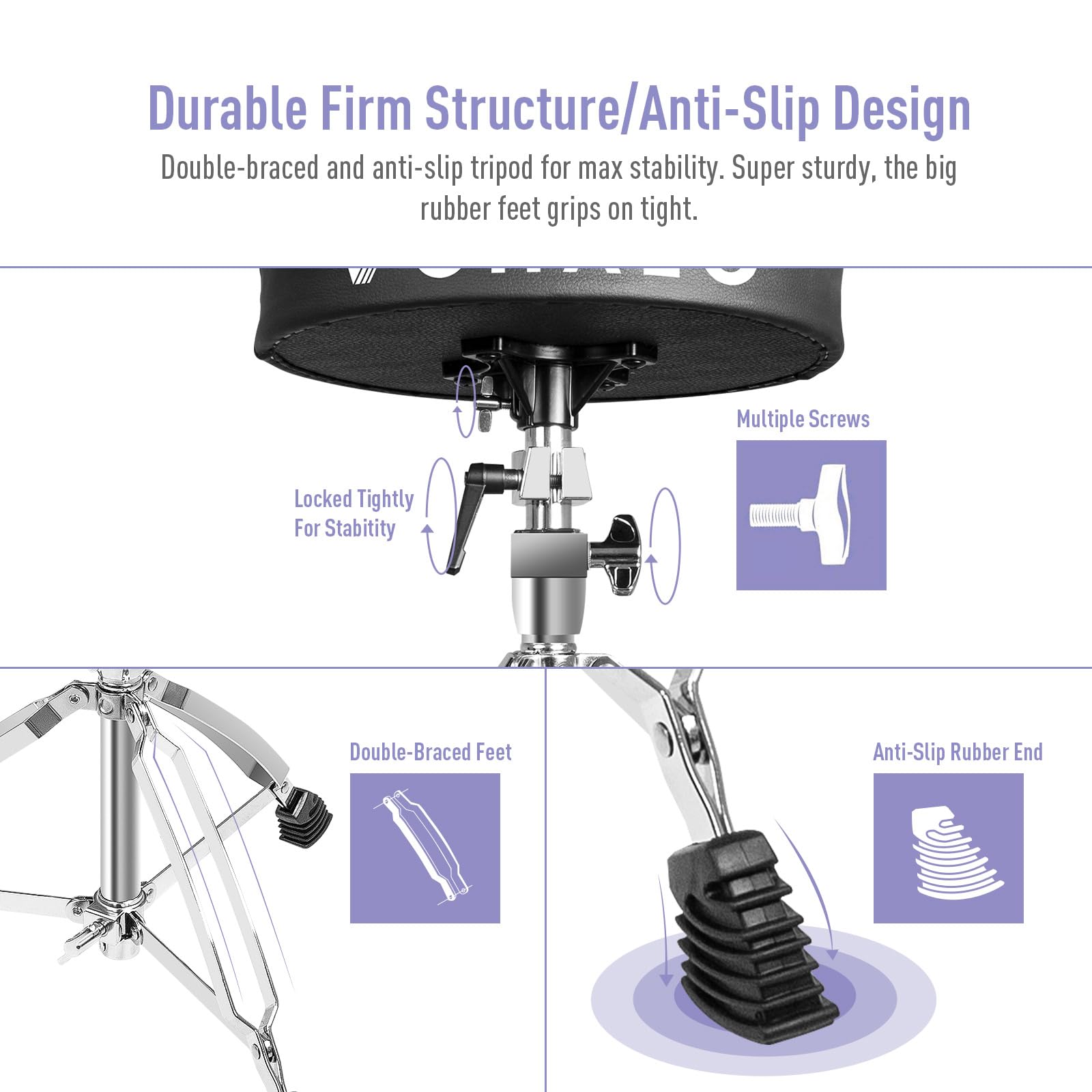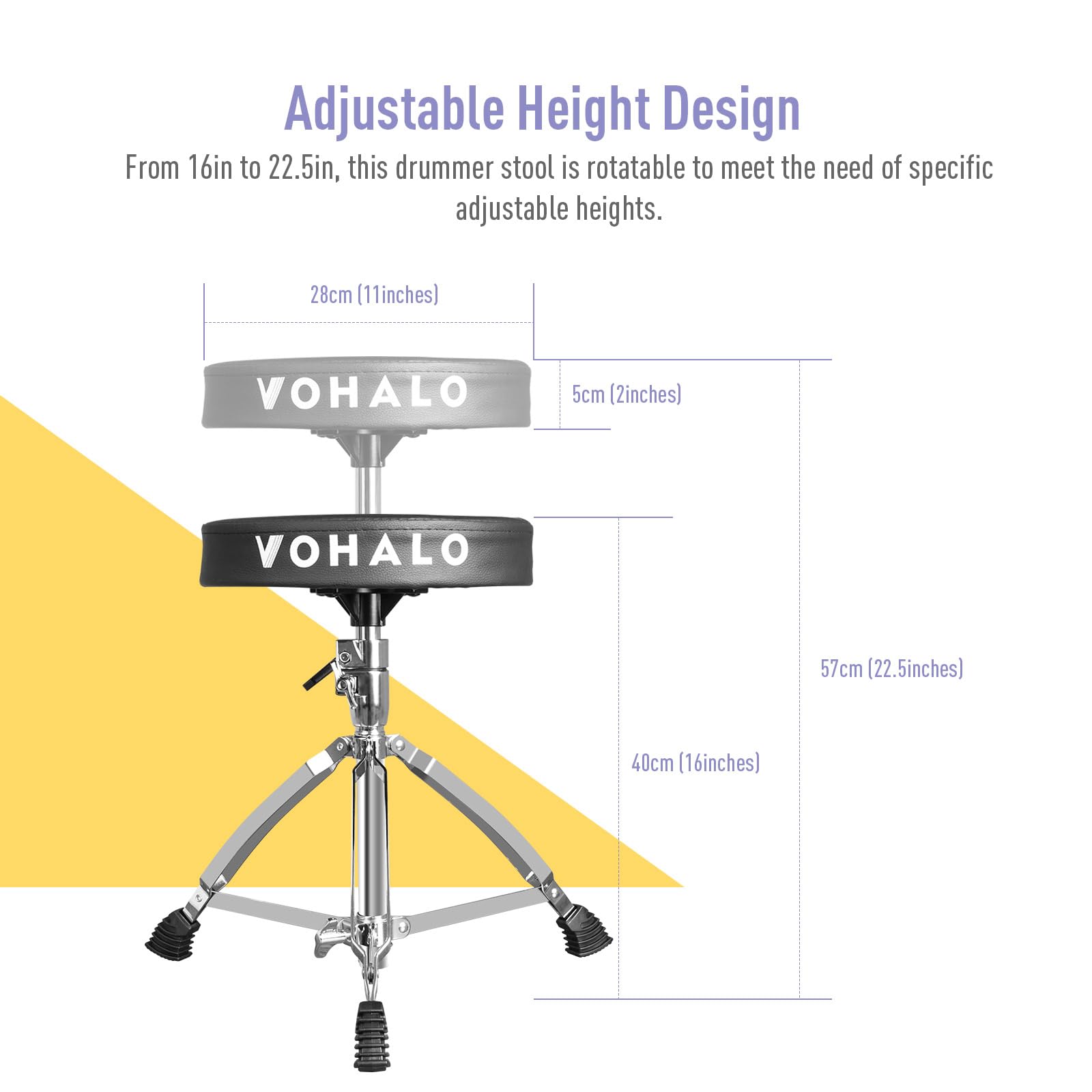 1. Taburete de tambor profesional hecho de material de metal de alta calidad y esponjas de alta densidad de 5 cm: las esponjas de alta densidad evitan que su taburete de tambor se deforme después de un uso prolongado, diámetro de tambor de 11″ con diseño triangular que lo hacen muy estable y duradero. 2. Altura ajustable: puede ajustar la altura fácilmente quitando el dispositivo de retención para ajustar la altura del taburete, la altura se puede ajustar de 16″ a 19″. El peso de nuestro taburete de tambor es de 6.40 libras (2.90 kg), lo cual es perfecto para adultos y niños que tocan su instrumento. 3. Antideslizante: este taburete de tres patas tiene tres mangas de goma antideslizantes para evitar que el taburete de tambor se desplace cuando toque el tambor. 4. Amplia aplicación: el Taburete de Tambor VOHALO se puede utilizar con una variedad de instrumentos diferentes, siendo el mejor compañero para el instrumento, pero también adecuado para una variedad de momentos en casa. 5. Taburete de tambor estable: el diámetro de tambor de 11″ (28 cm) con diseño triangular lo hacen muy estable y duradero.