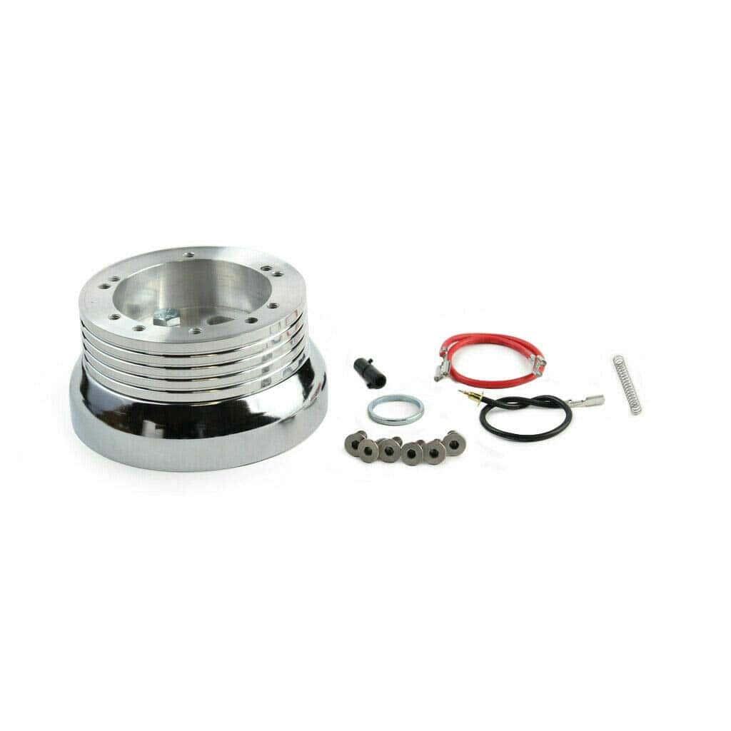 Volante Billet de 14″ + Adaptador compatible con Chevy 69-94 – Forrado en Cuero + Bocina Chevy Incluye: Volante SI Botón de Bocina SI Adaptador de Instalación SI DESCRIPCIÓN: – Se atornilla directamente a adaptadores de 5 orificios o liberación rápida: Forever Sharp, Momo, NRG, Sparco, Grant, etc. – Nuestro patrón de 5 orificios es estándar y es compatible con la mayoría de otras marcas. – Incluye un adaptador de instalación. Nota: Si no puede encontrar un adaptador de volante para su vehículo, por favor contáctenos directamente. Compatibilidad con Vehículos (compatible con): -(compatible con) Todos los columnas de Flaming River/Ididit que usan estriados de GM de modelo reciente -(compatible con) Todos los coches Chevrolet (1969-94) excluyendo el Corvette, Sprint, Spectrum, y el Nova 86-88 -(compatible con) Todos los camiones Chevrolet (1974-94) – (compatible con) Sprint, El Camino, Caballero (1967-88) – (compatible con) Todas las camionetas Chevy/GMC (1982-1994) -(compatible con) Todos los Buicks con columnas no telescópicas (1969-93) – (compatible con) Jeep CJ5, CJ6, CJ7, Wrangler, Cherokee, Wagoneer, Pick-up, Scrambler, Comanche (1976-95) – (compatible con) Todos los Oldsmobiles sin columnas telescópicas (1969-93) – (compatible con) Todos los Pontiac excluyendo LeMans (1969-93)
