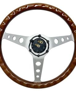 Volante Clásico de Madera Hiracing de 14 pulgadas Universal, Cepillado, 3 Radios, Profundidad de 1.5 pulgadas con Botón de Claxon 6 Tornillos