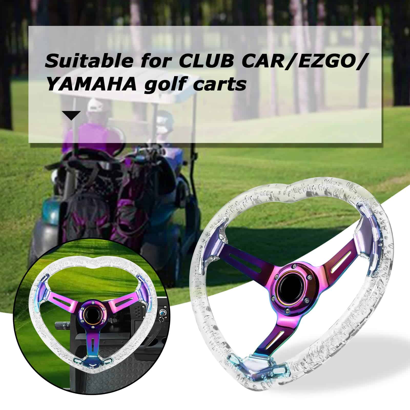 5. COMPATIBILIDAD: Este volante es compatible con la mayoría de los adaptadores de cubo estándar, adecuado para la mayoría de los vehículos y coches de carreras. Lo mismo se aplica a los carritos de golf CLUB CAR/EZGO/YAMAHA, pero debe instalarse con un adaptador cromado para carrito de golf. Se recomienda buscar videos relacionados en youtube para obtener pasos de instalación específicos. (Nota: Los adaptadores de cubo de rueda y los adaptadores de volante de carrito no están incluidos. Seleccione el adaptador de volante adecuado para su modelo antes de instalarlo.)