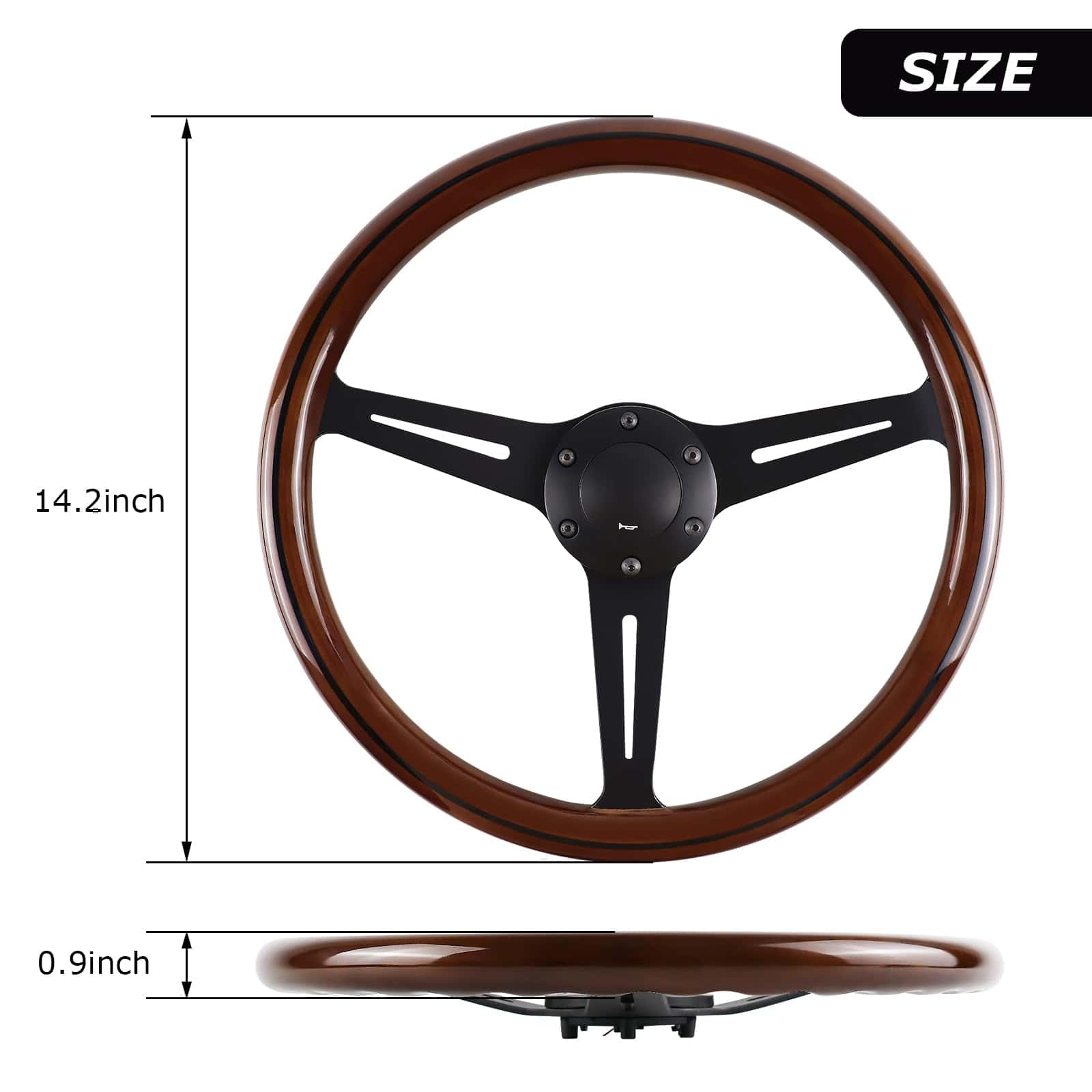 2. Diseño ergonómico: Diámetro del producto del volante de madera de 15 pulgadas. Las hendiduras suaves en los dedos en la parte trasera del volante para una sensación de agarre cómoda.